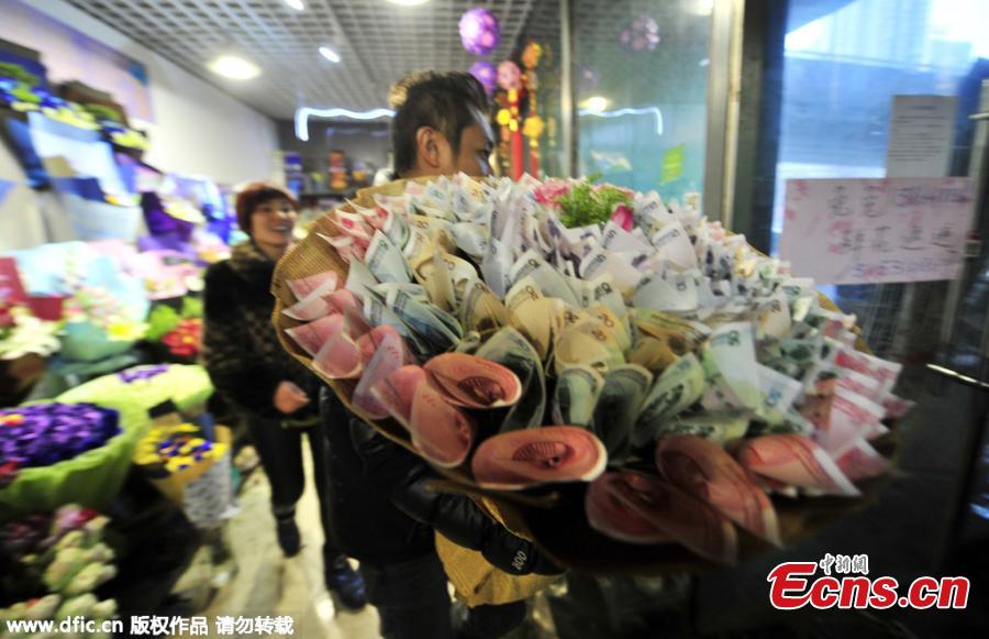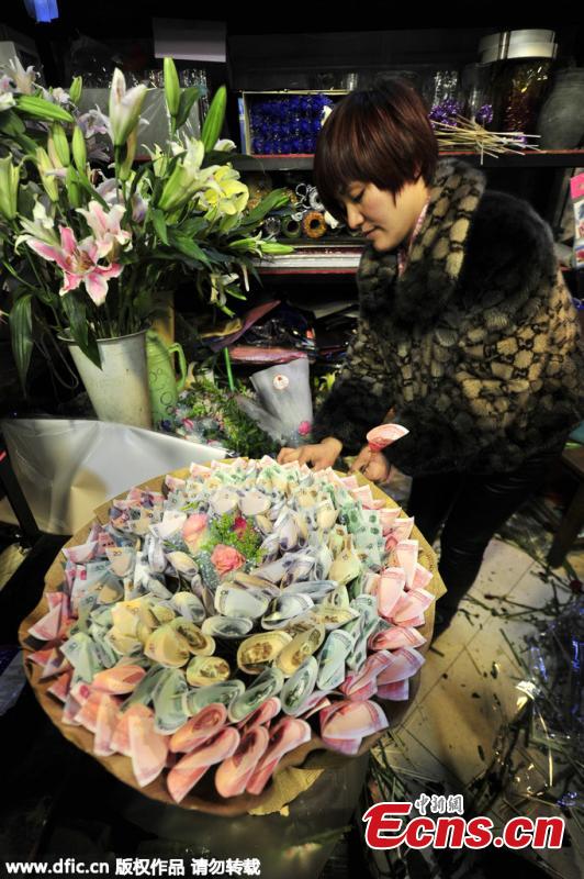A staff member at a flower shop prepares a bouquet of flowers made from Chinese yuan notes in Jinan City, the capital of East China’s Shandong Province, Feb. 14, 2016. Some 20 five-yuan notes, 19 ten-yuan notes, 35 twenty-yuan notes, 40 fifty-yuan notes and 40 one-hundred-yuan notes were used to make the artificial flower, which was a Valentine's Day gift. The customer also paid 800 yuan ($121) to the shop as a service fee. He said he visited more than ten banks to collect the brand new notes, worth 6,990 yuan in total, used to make the flower. (Photo/IC)