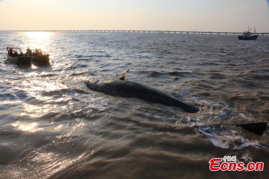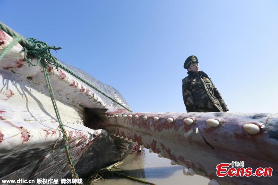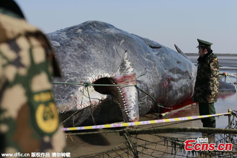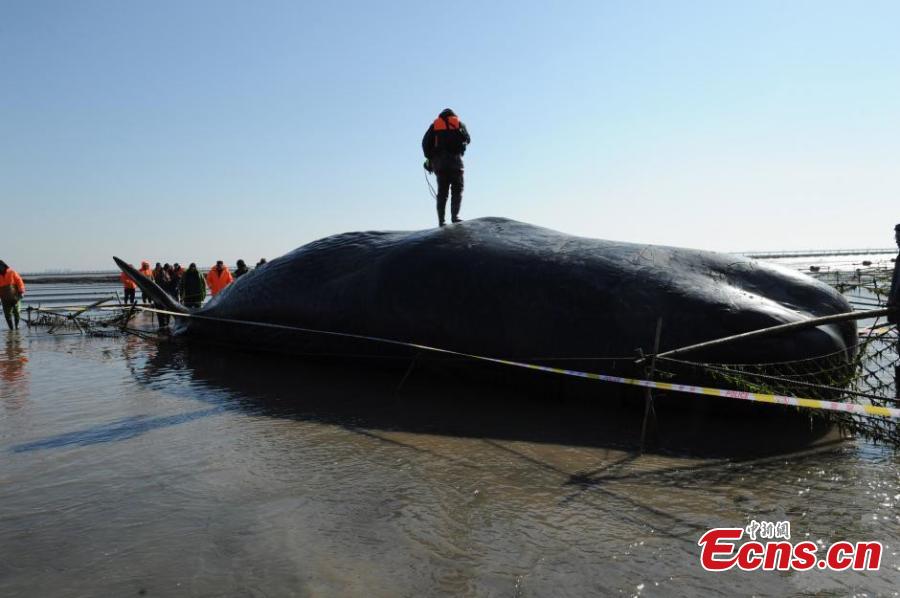 A dead whale lies on the sand after being washed ashore in Rudong County, East China's Jiangsu Province, Feb. 15, 2016. Two whales, initially thought to be sperm whales, were found stranded on Sunday morning. (Photo/IC)