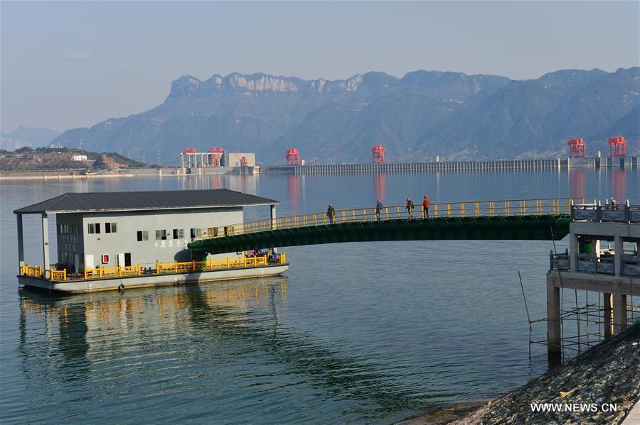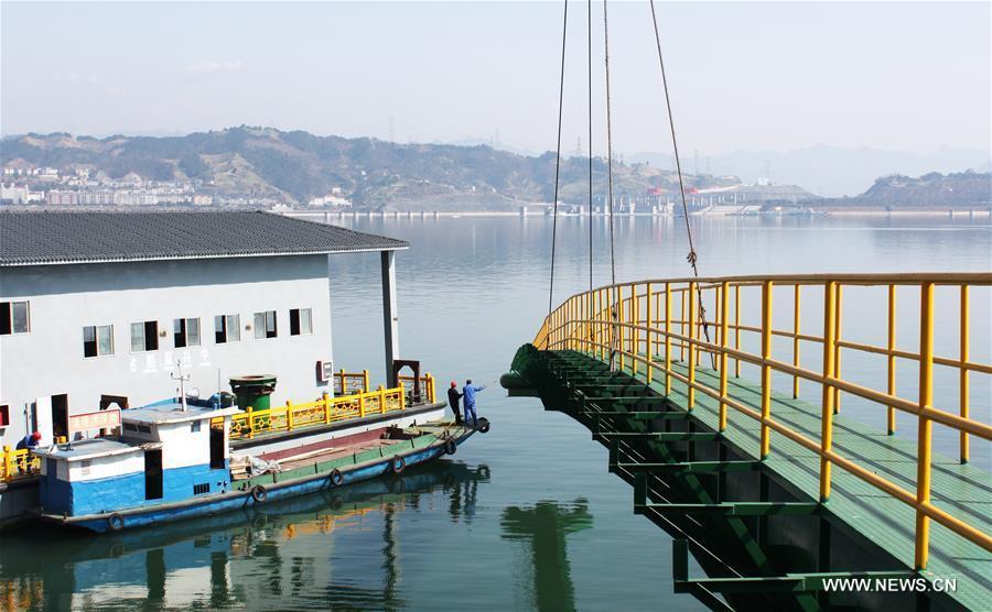 Photo taken on Feb. 16, 2016 shows the first pumping vessel in front of the Three Gorges Dam in Zigui, central China's Hubei Province. The construction of the first pumping vessel in front of Three Gorges Dam was finished on Tuesday. The pumping station, which consists of a vessel and a water transmission pipe with all-direction flexible joint, is able to shift with the fluctuation of water level. (Photo: Xinhua/Chen Xianfeng)