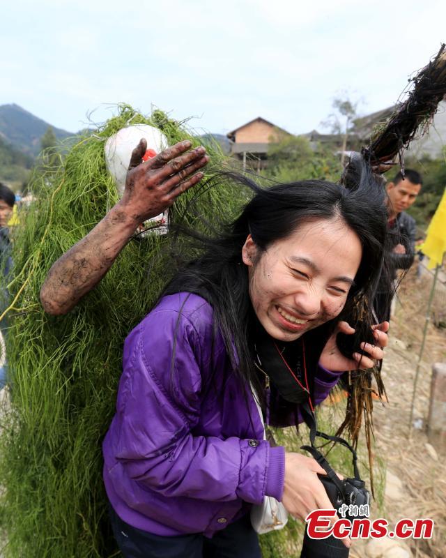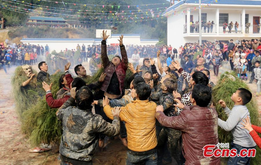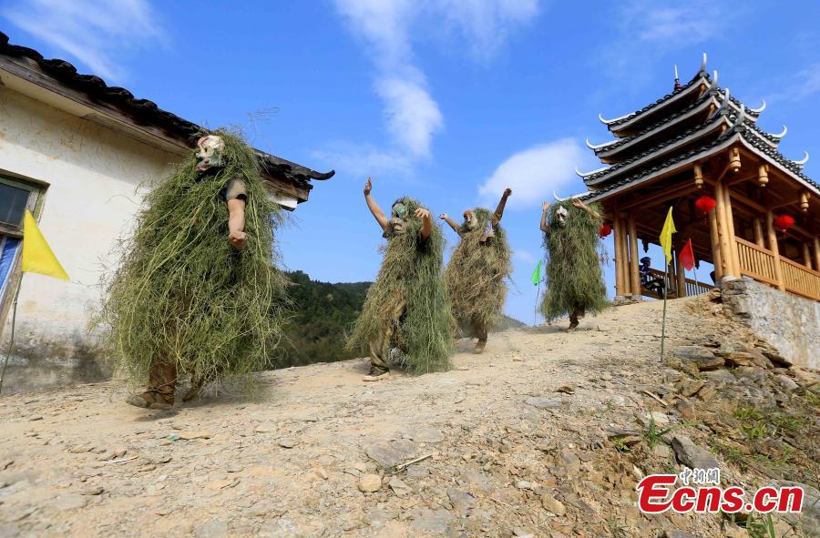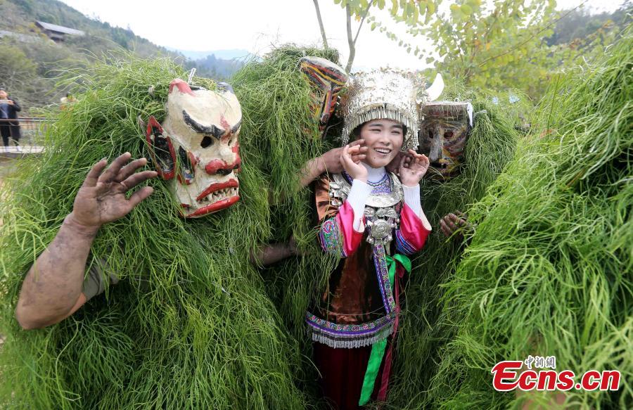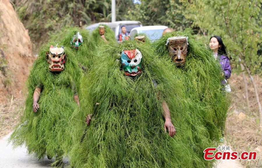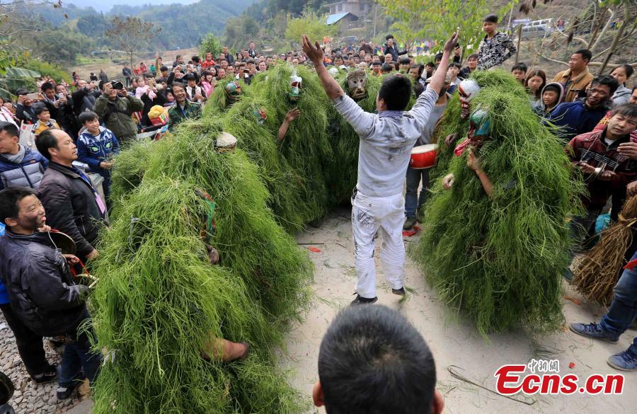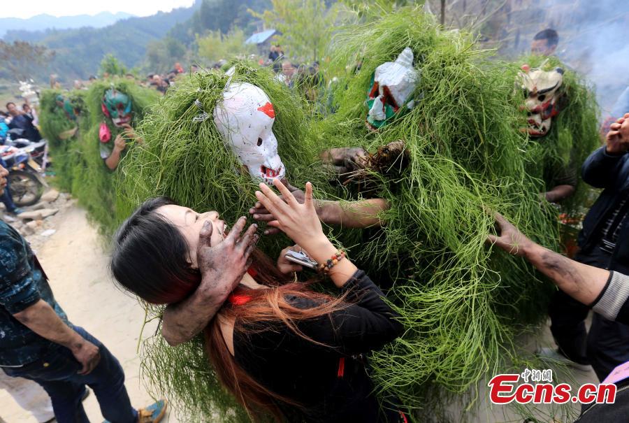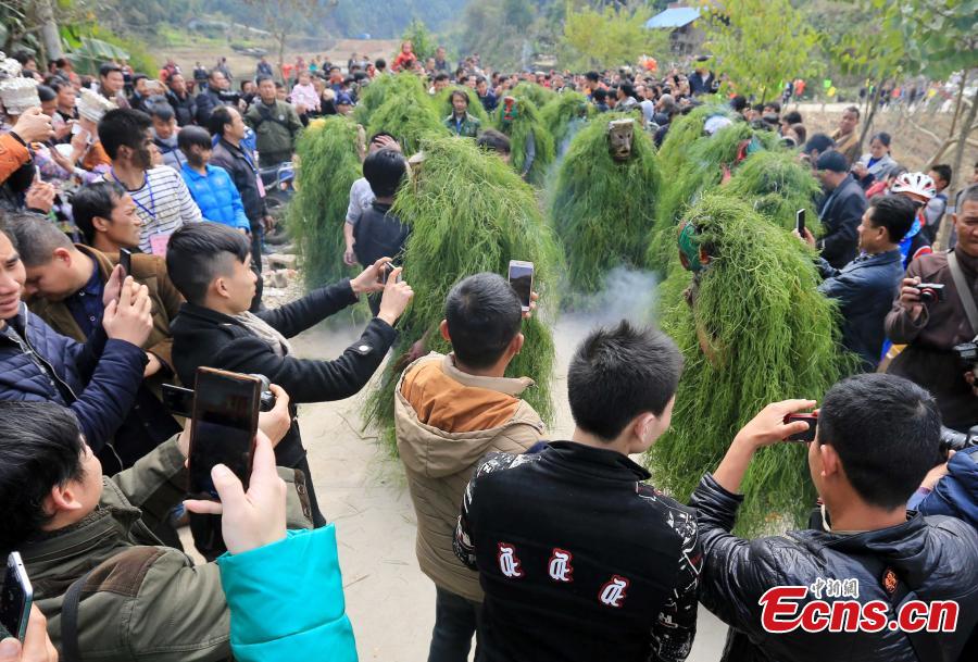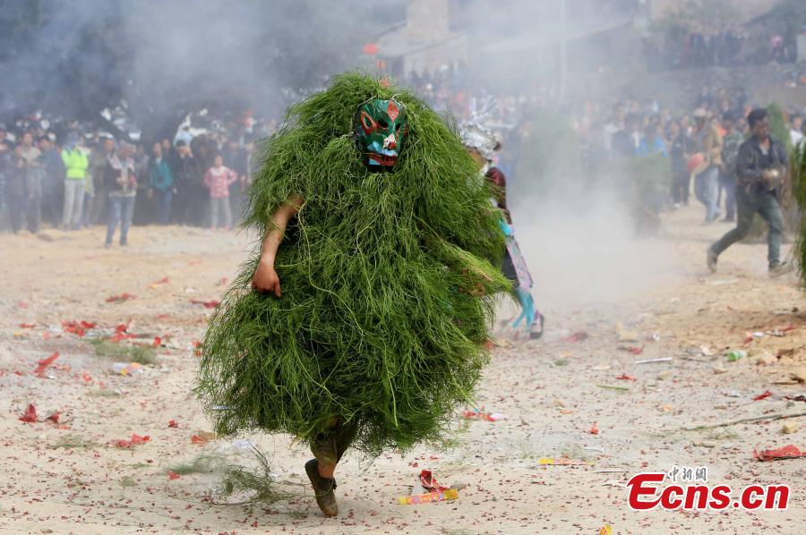 Ethnic Miao people wearing masks and costumes dress up as "Manggao", a legendary creature in the Miao culture, during the Manggao festival celebration in Rongan County, Southwest China’s Guangxi Zhuang Autonomous Region, Feb. 16, 2016. During the festival, the Manggao performers will dance and apply black ash on the faces of local residents, believing this will bring good fortune in the coming new year, according to local reports. (Photo: China News Service/Huang Guoliang)