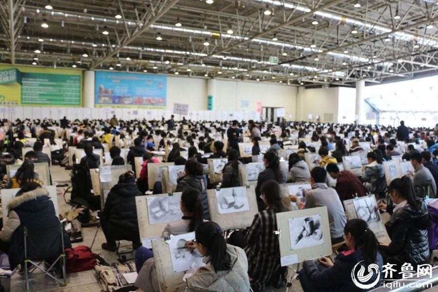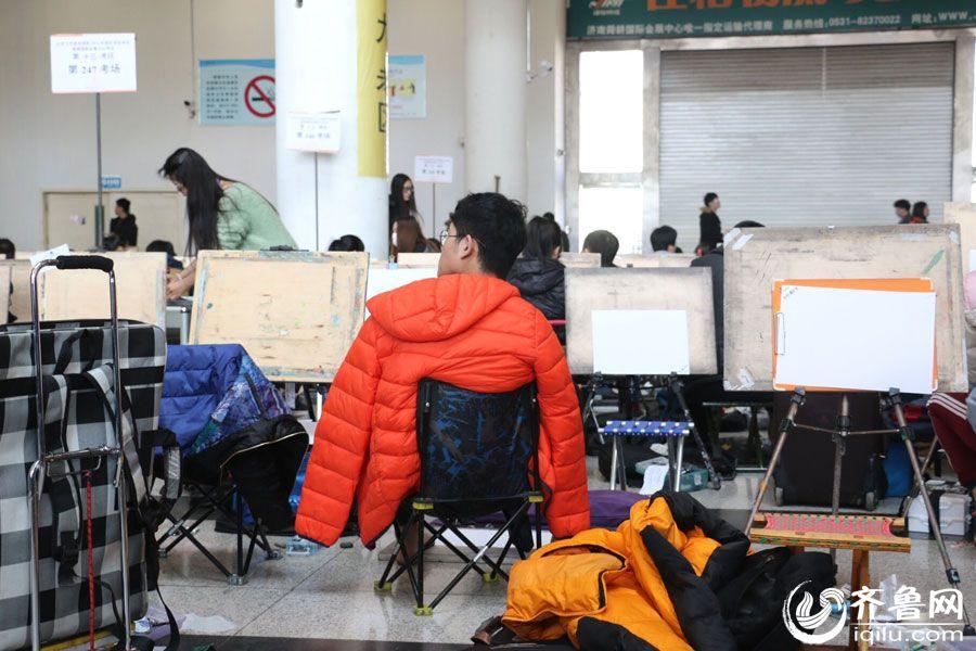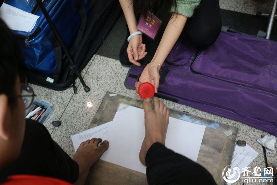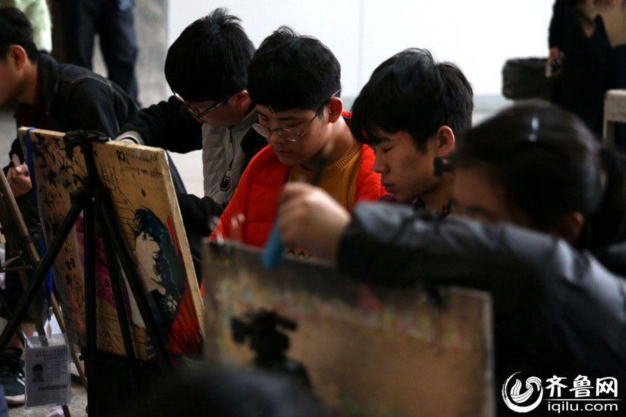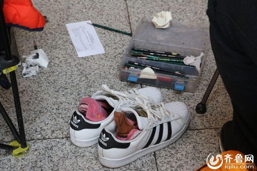 A student who painted with feet went viral online as the art examination started in east China's Shandong province on Feb. 16, 2016. Unlike other students, he did not put the drawing board on the shelf, but put it on the ground. This boy finished the examination barefooted at minus 8 degrees Celsius. (Photo/Iqilu.com)