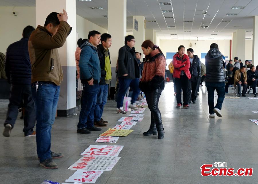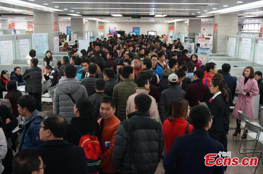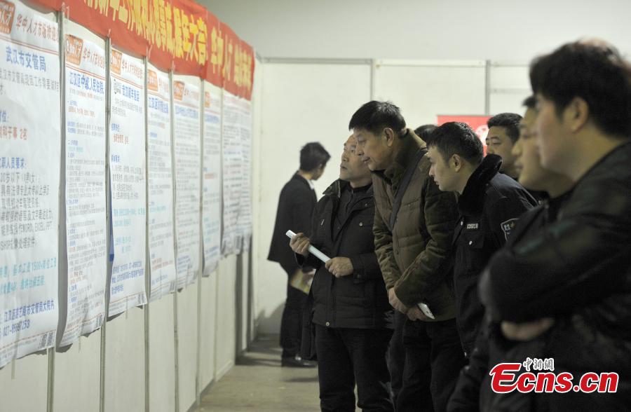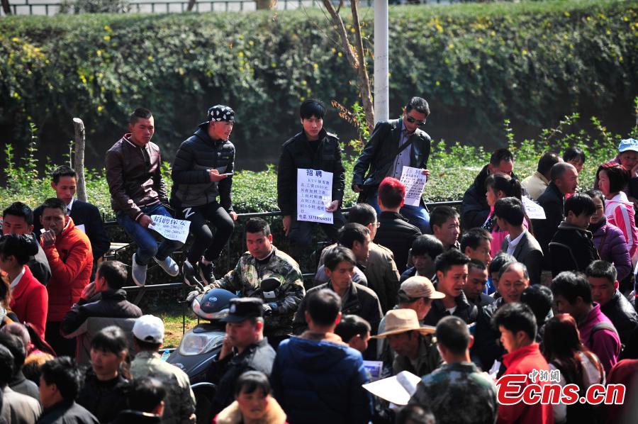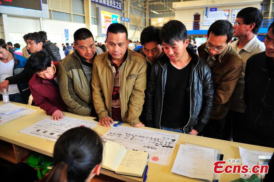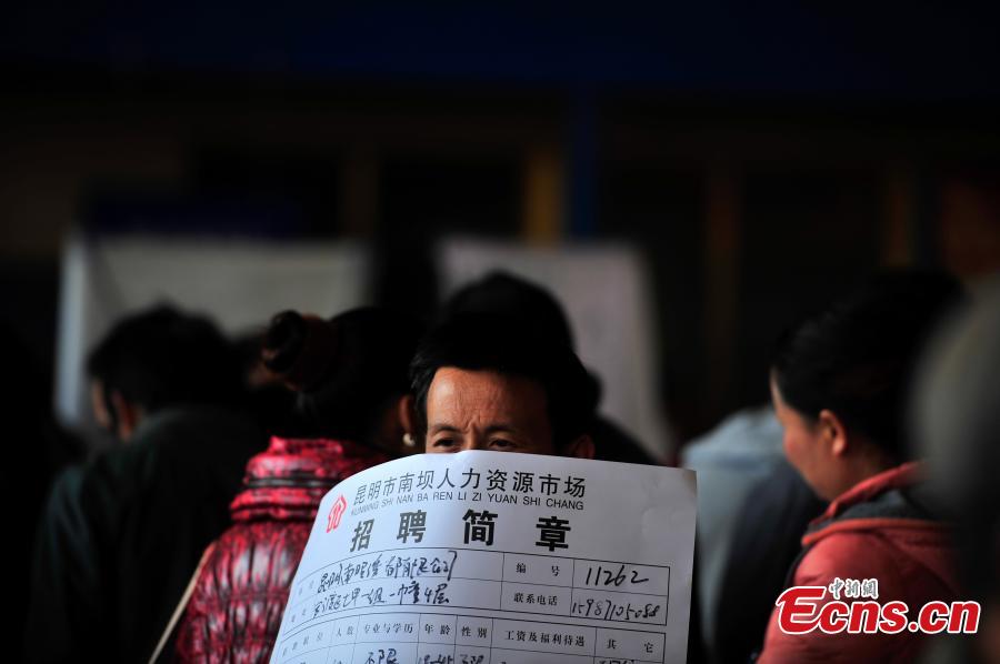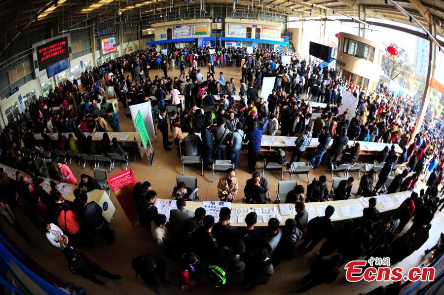 Job seekers check for vacancies at a job fair after Chinese Lunar New Year holiday in Kunming City, the capital of Southwest China’s Yunnan Province, Feb. 17, 2016. (Photo: China News Service/Liu Ranyang)