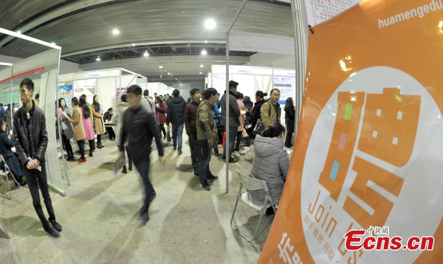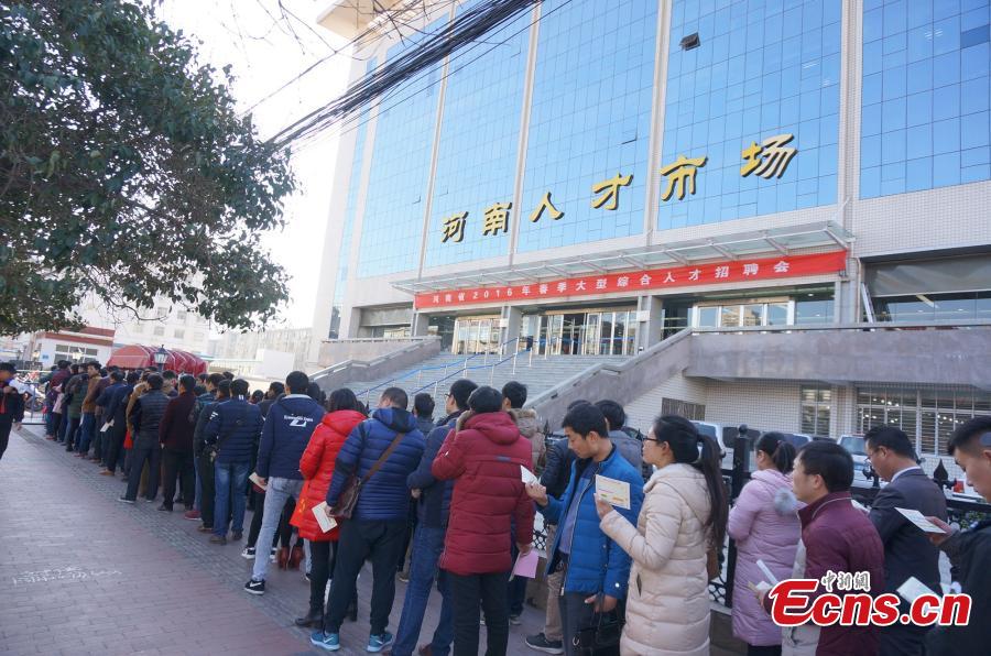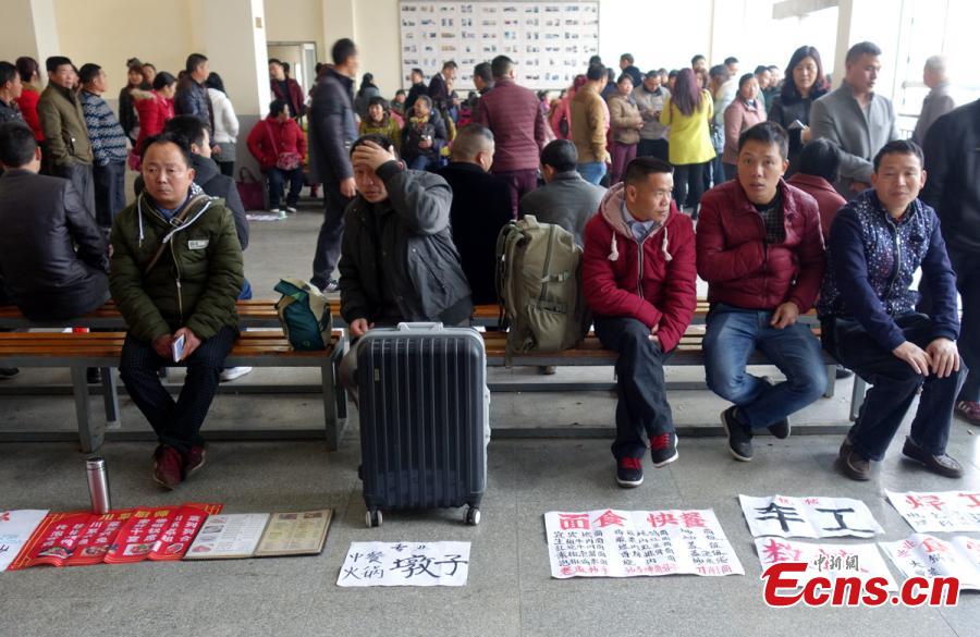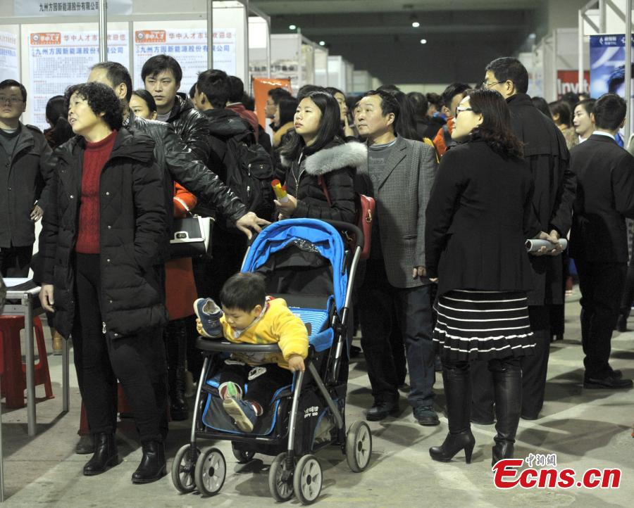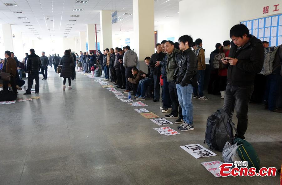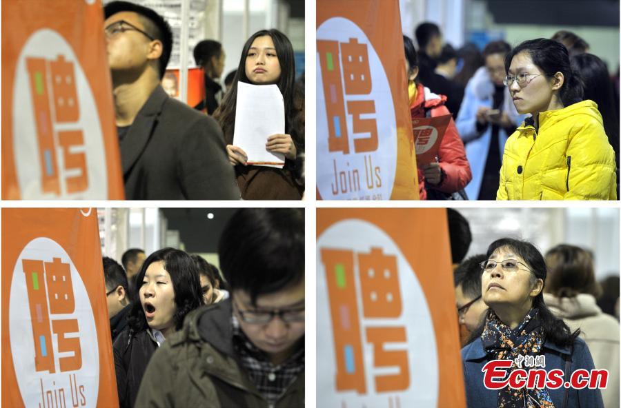 Job seekers check for vacancies at a job fair after Chinese Lunar New Year holiday in Kunming City, the capital of Southwest China’s Yunnan Province, Feb. 17, 2016. (Photo: China News Service/Liu Ranyang)
