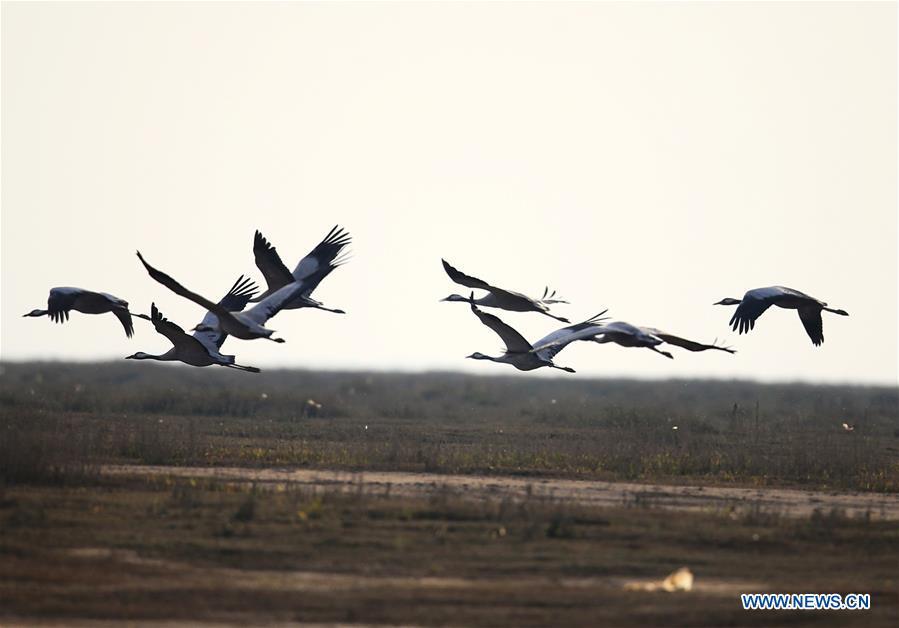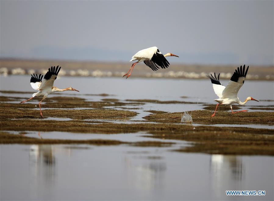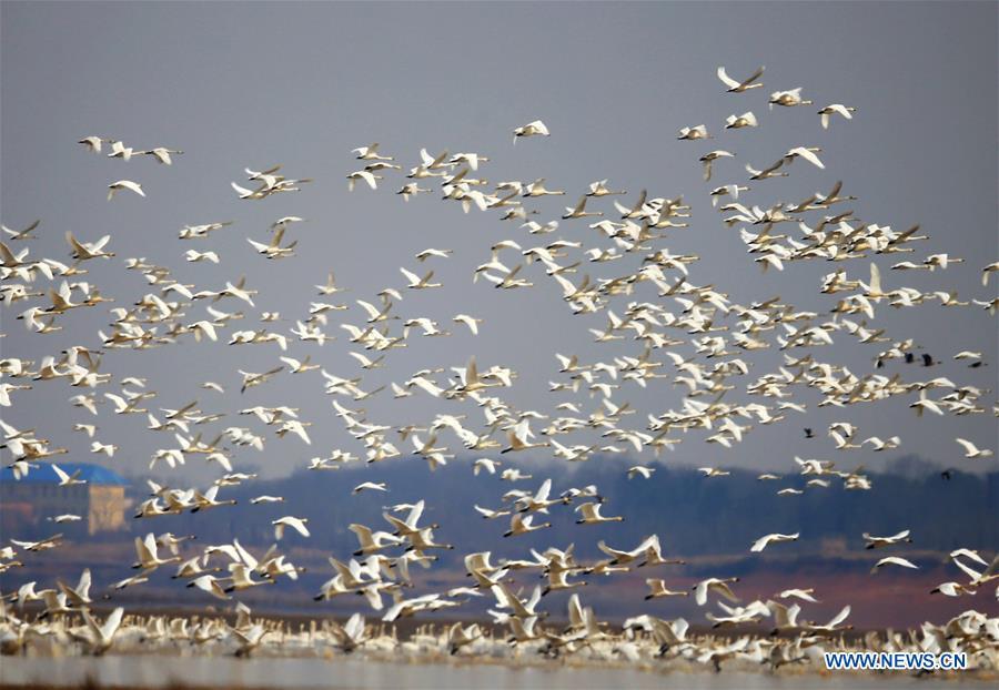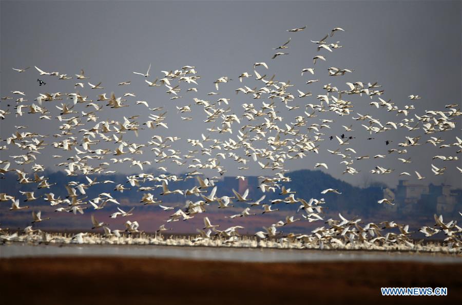 White cranes fly over the Poyang Lake in Duchang County, east China's Jiangxi Province, Feb. 18, 2016. Migratory birds prepared to fly back to the north after spending winter here. (Photo: Xinhua/Yang Fan)