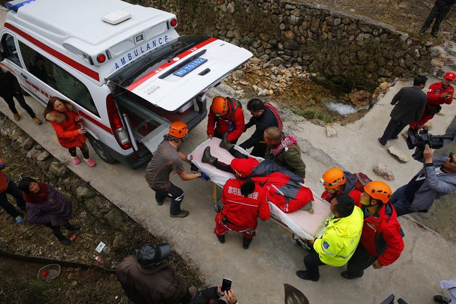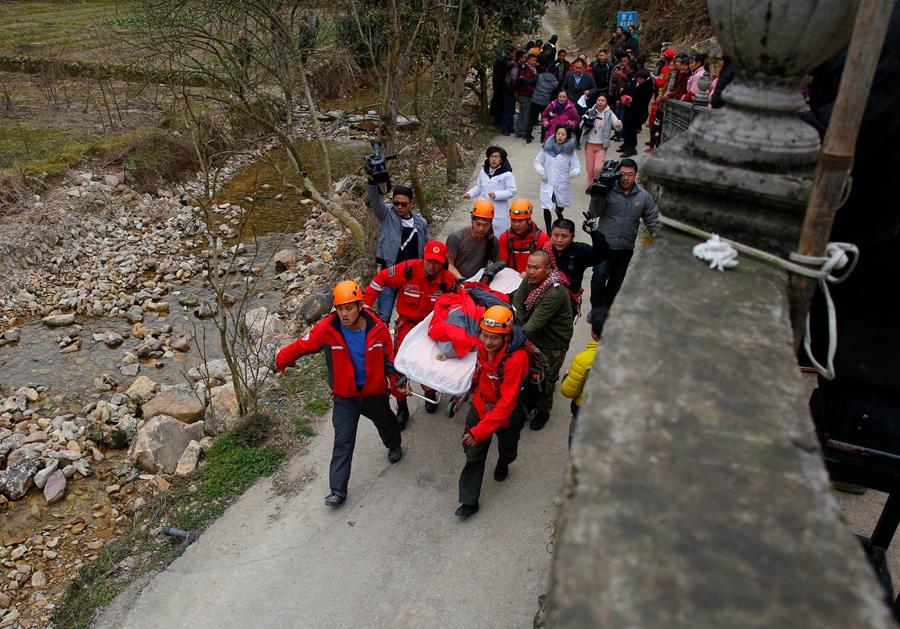 Rescuers carry a child on a stretcher in Zhejiang province, Friday, Feb 19, 2016. (Photo by Shen Zhicheng/for chinadaily.com.cn)