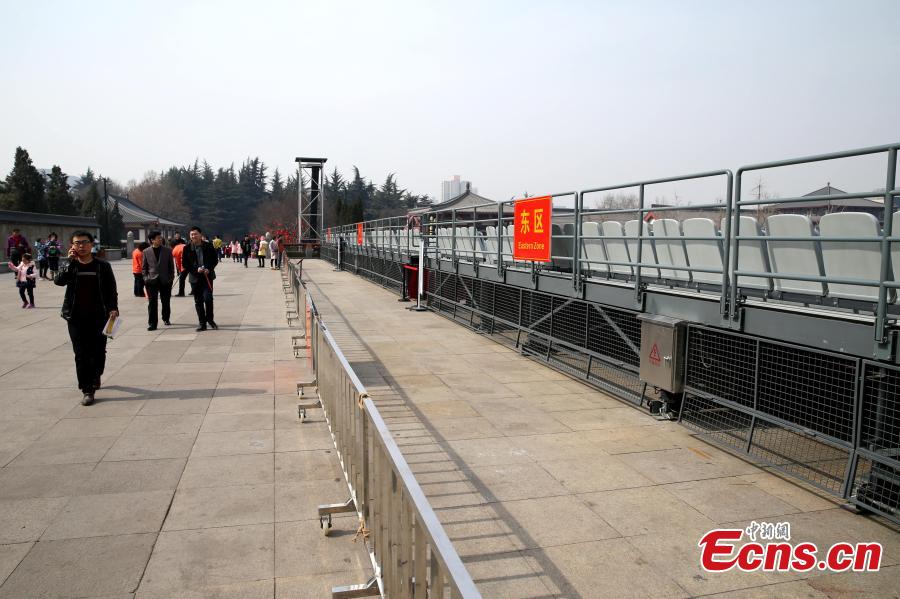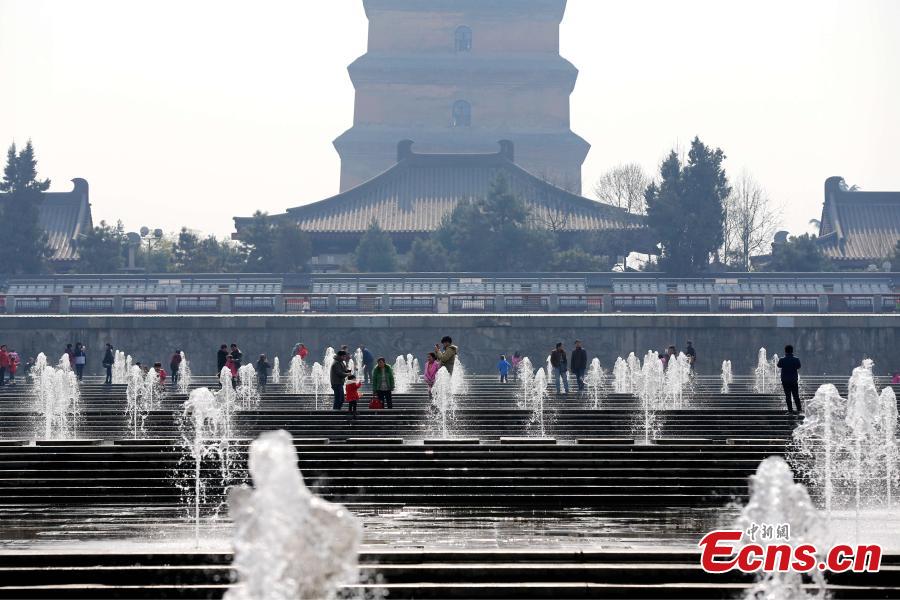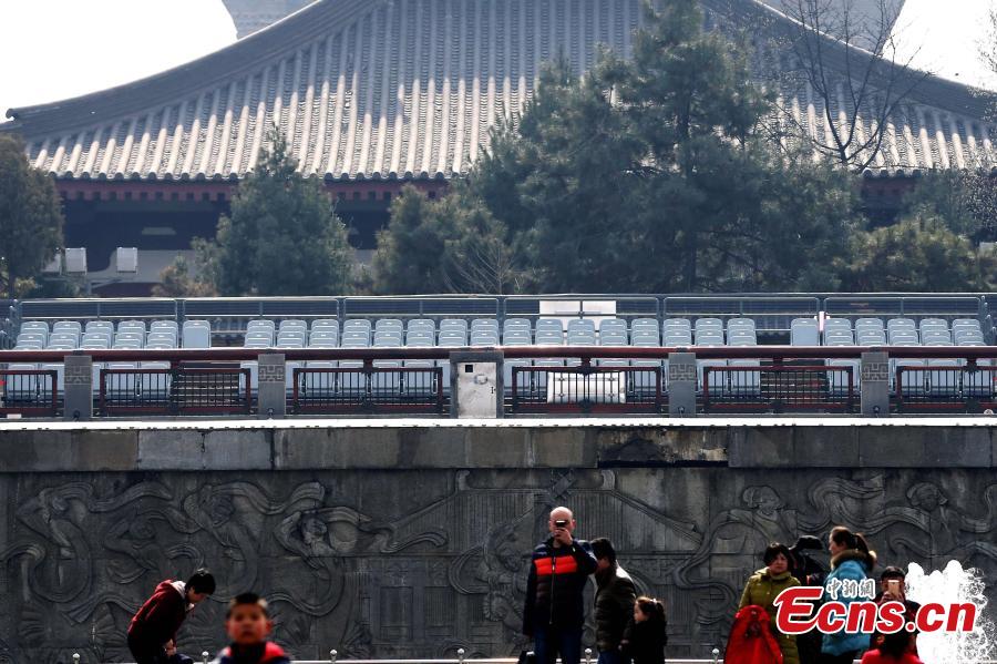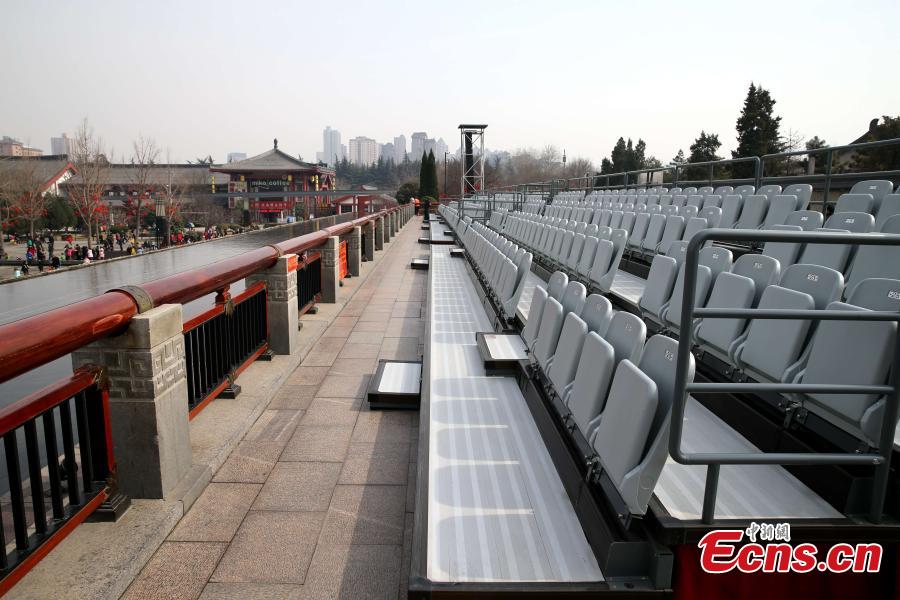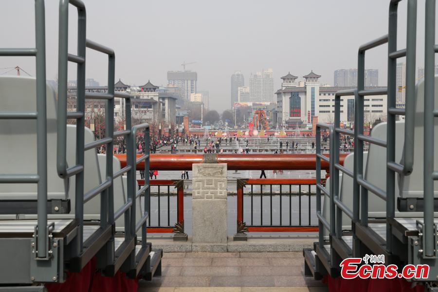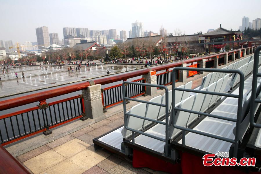 Lines of seats are placed on a platform near the Music Fountain Square at the Giant Wild Goose Pagoda scenic spot in Xi’an City, the capital of Northwest China’s Shaanxi Province, Feb. 18, 2016. The fountain features a 20-minute performance, which has been free for visitors to see since its creation in 2003. However, visitors are now required to pay 30 yuan ($4.6) to use one of the newly-built seats. Although they offer the best view of the performance, people are complaining about being charged for the service. (Photo: China News Service/Zhang Yuan)