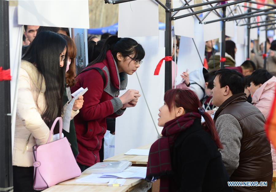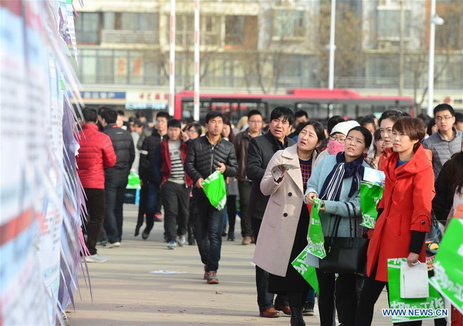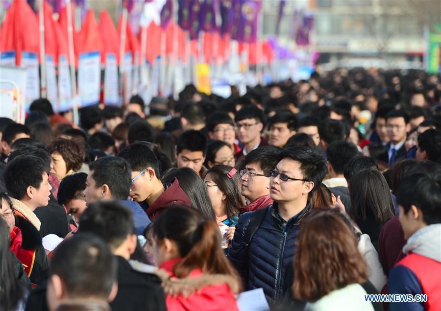Graduates attend a job fair in Shijiazhuang, capital of north China's Hebei Province, Feb. 19, 2016. Over 40, 000 jobs were offered during the job fair. (Xinhua/Zhu Xudong)