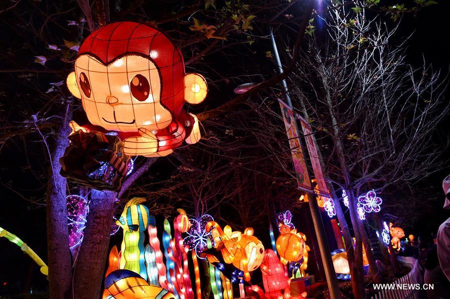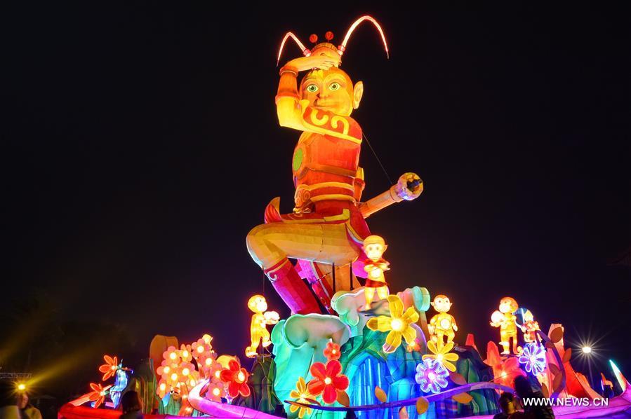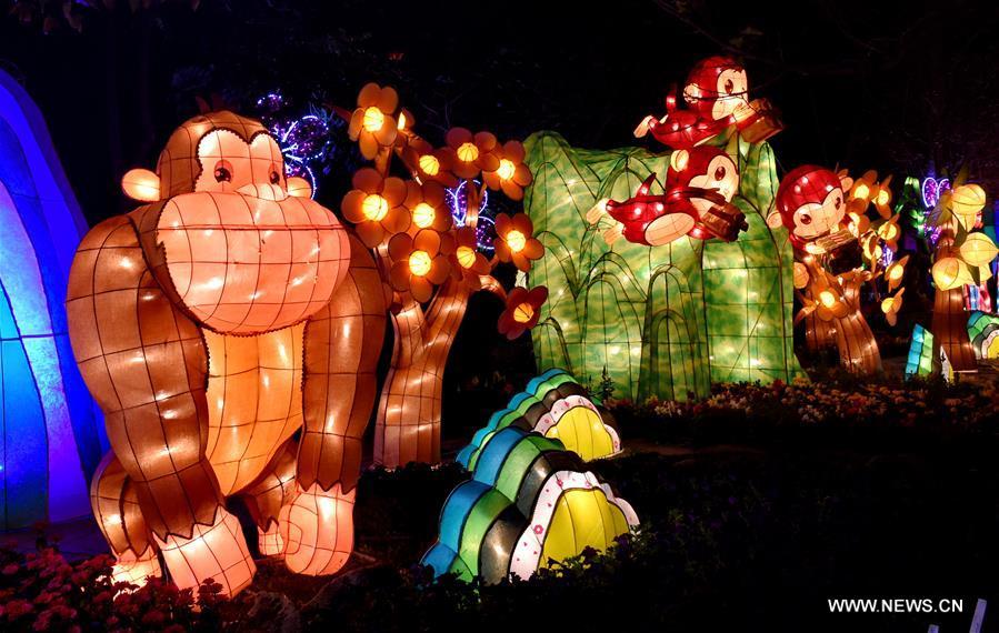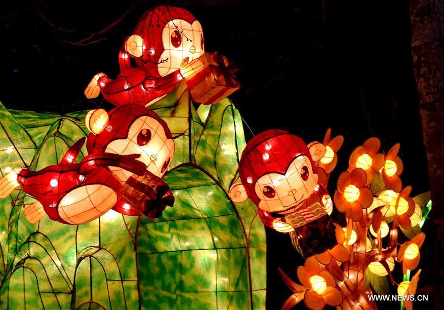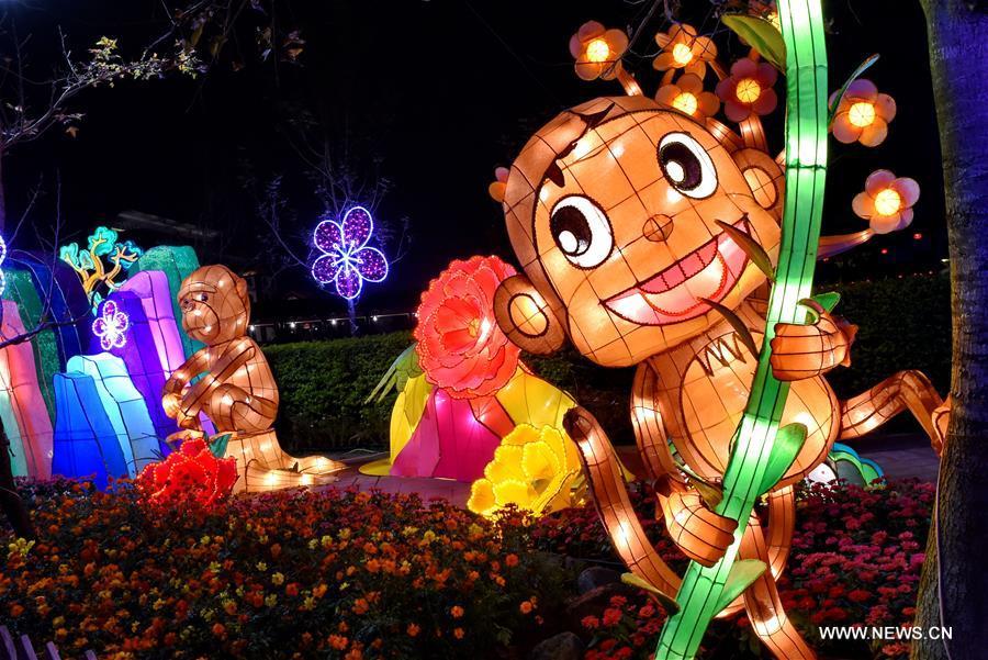 A monkey-themed lantern is seen in Fo Guang Shan in Kaohsiung, southeast China's Taiwan, Feb. 20, 2016. According to Chinese zodiac, 2016 is the Year of the monkey. The Fo Guang Shan lantern show is held to greet the traditional Chinese Lantern Festival which falls on Feb. 22 this year. (Xinhua/Zhang Guojun)