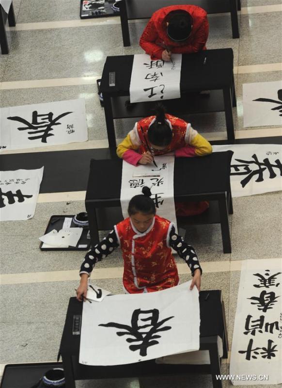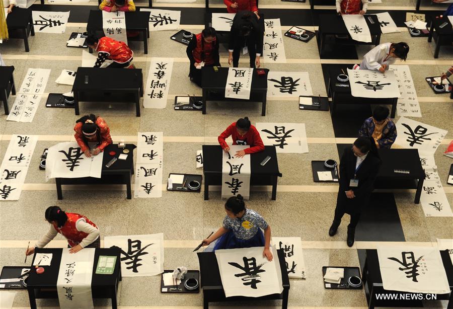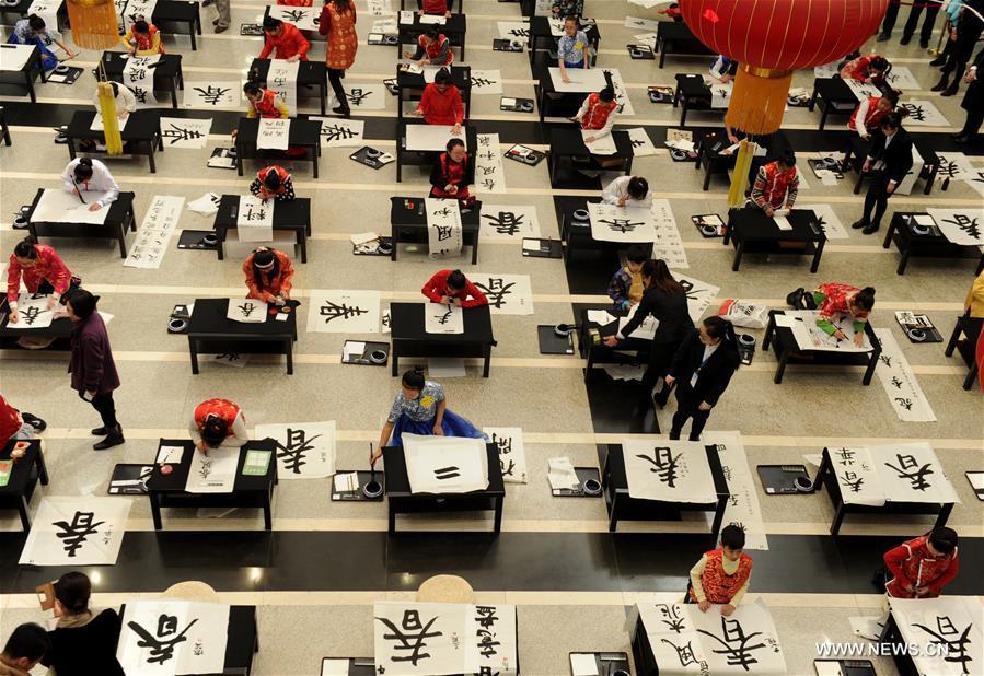 People take part in a calligraphy contest in Dalian, northeast China's Liaoning Province, Feb. 20, 2016. A calligraphy contest on handwriting of Chinese character "Chun", which means spring in English, was held here on Saturday. (Xinhua/Lv Wenzheng)