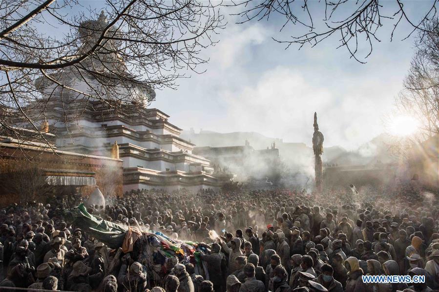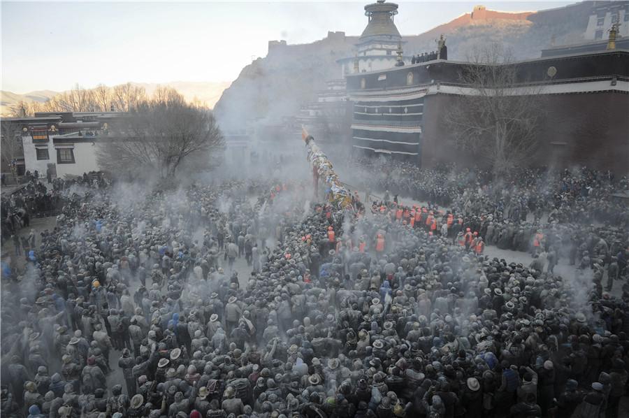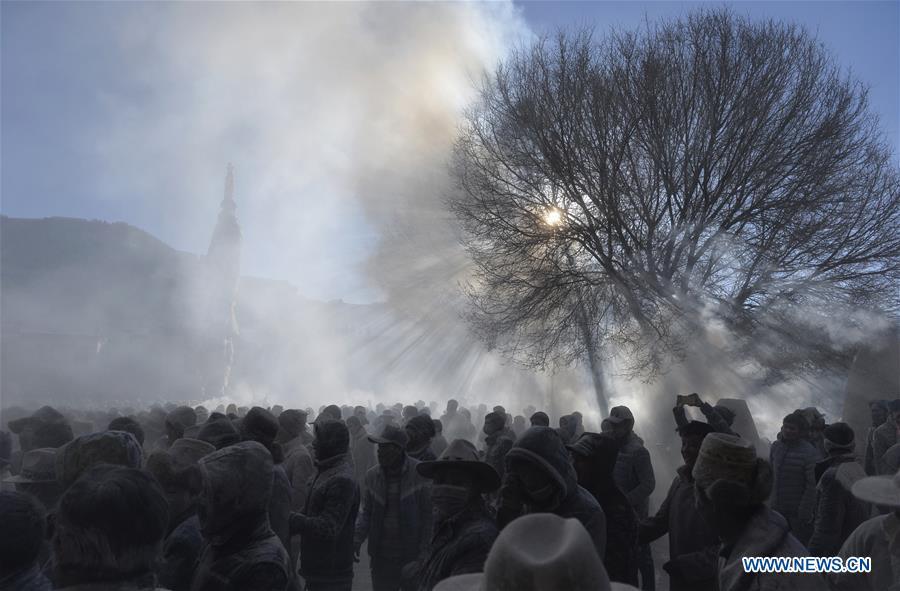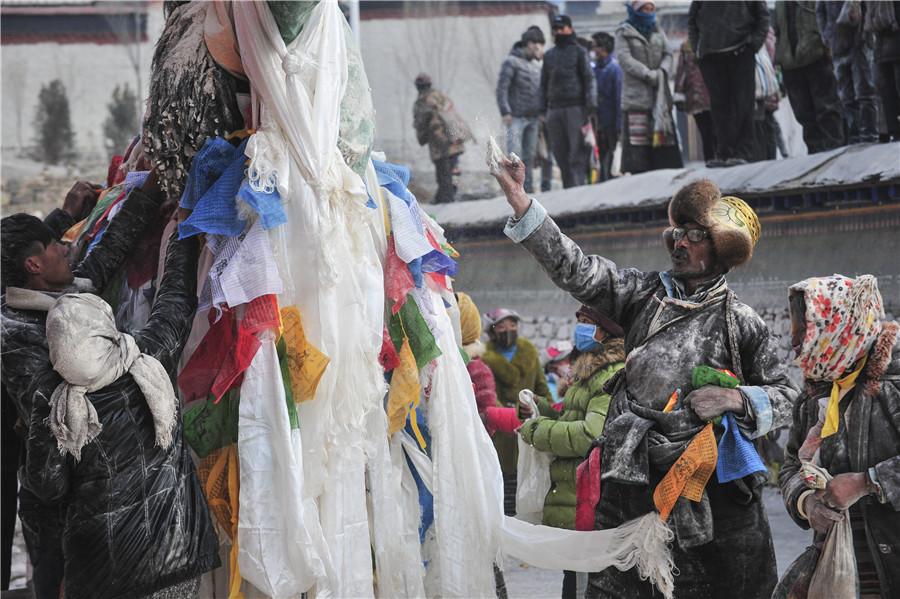 Tibetans join a zanba fight as people throw zanba, a Tibetan food made from roasted barley flour, in each other's faces to wish good luck and harvest in new year in Gyangze County in Xigaze, southwest China's Tibet Autonomous Region, Feb. 22, 2016. (Photo: Xinhua/Liu Dongjun)