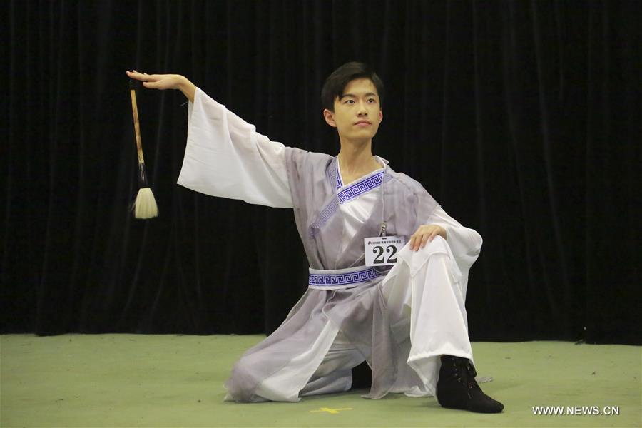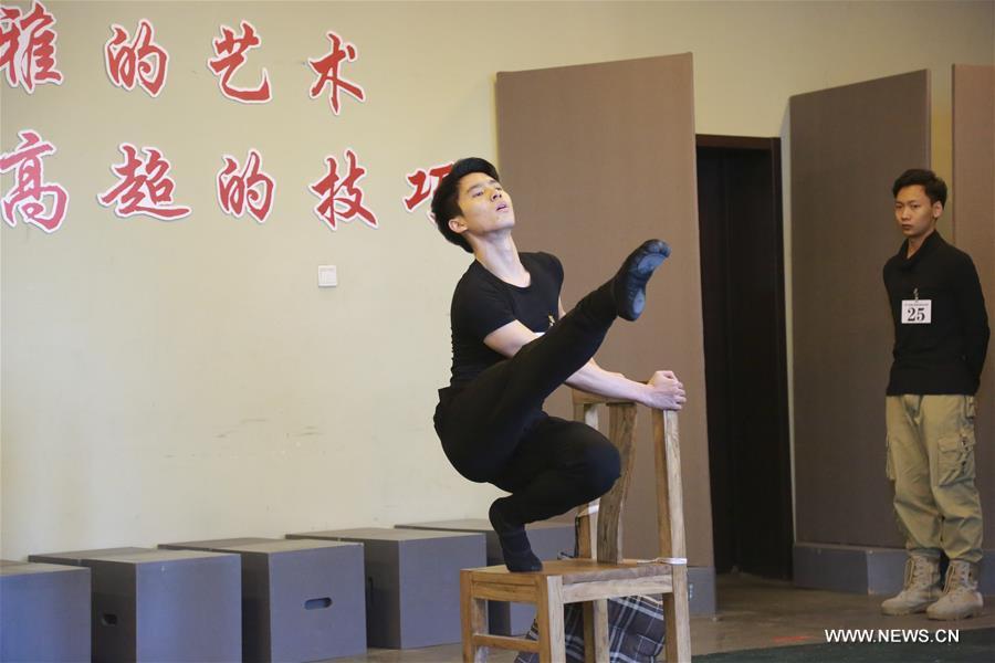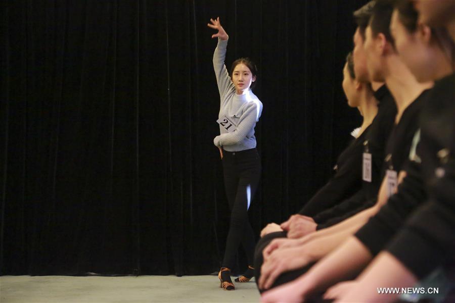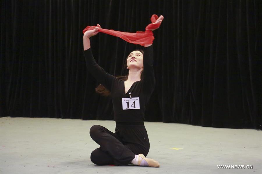 A candidate performs during a second examination at Beijing Film Academy in Beijing, capital of China, Feb. 23, 2016. A total of 2,039 candidates were entitled to compete for 45 admission positions at the School of Performance of Beijing Film Academy on Feb. 23. (Photo: Xinhua/Wen Kangwei)