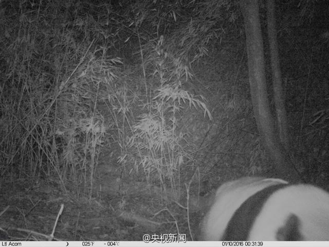 A wild giant panda was recently spotted in a nature reserve in northwest China's Shaanxi Province, according to local authorities on February 23, 2016. Staff at the Huangguanshan Nature Reserve found the panda searching for food on tapes obtained from 30 infrared cameras installed in the reserve, said Liu Gefei, deputy head of the reserve's administration. "We concluded from the pictures that the panda is a subadult weighing about 60 kg," Liu said. Last year, reserve staff discovered a wild panda in the area for the first time. (Photo/Weibo account of cctv.com)