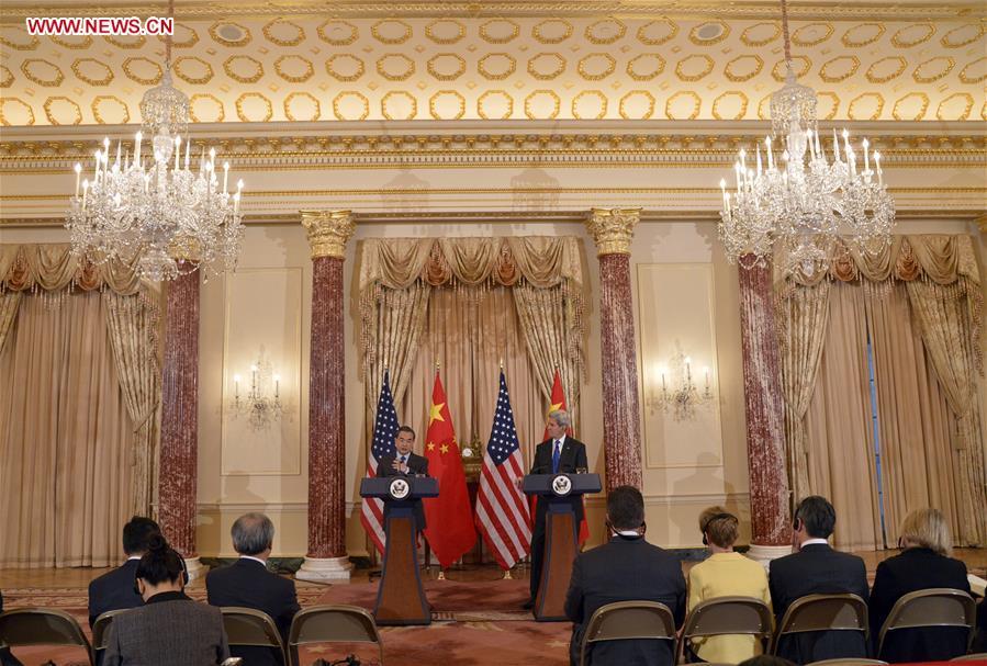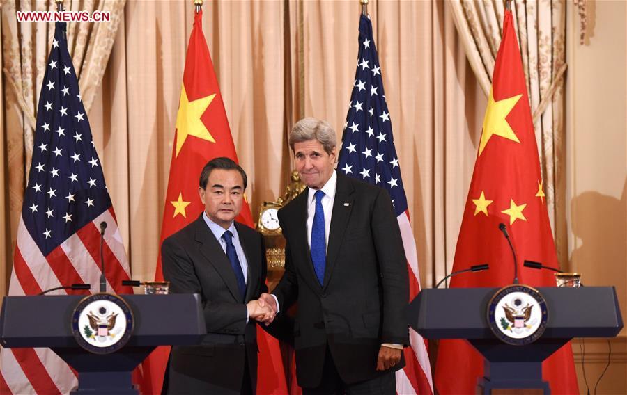 U.S. Secretary of States John Kerry (R) meets with Chinese Foreign Minister Wang Yi in Washington D.C., the United States, Feb. 23, 2016. Freedom of navigation in the South China Sea has not been a problem and demilitarization in the region needs efforts of all parties related, Chinese Foreign Minister Wang Yi said here on Tuesday. (Photo: Xinhua/Yin Bogu)