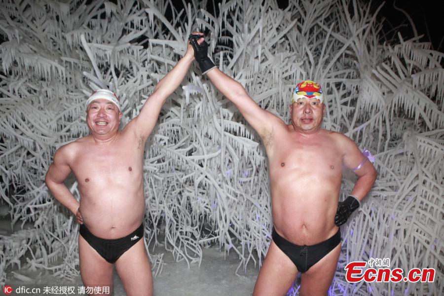 Some ten members of a winter swimming team challenge the freezing temperature of minus 30 degrees centigrade to swim in the Heihe River in Heihe City, Northeast China’s Heilongjiang Province, Feb. 22, 2016. (Photo/IC)