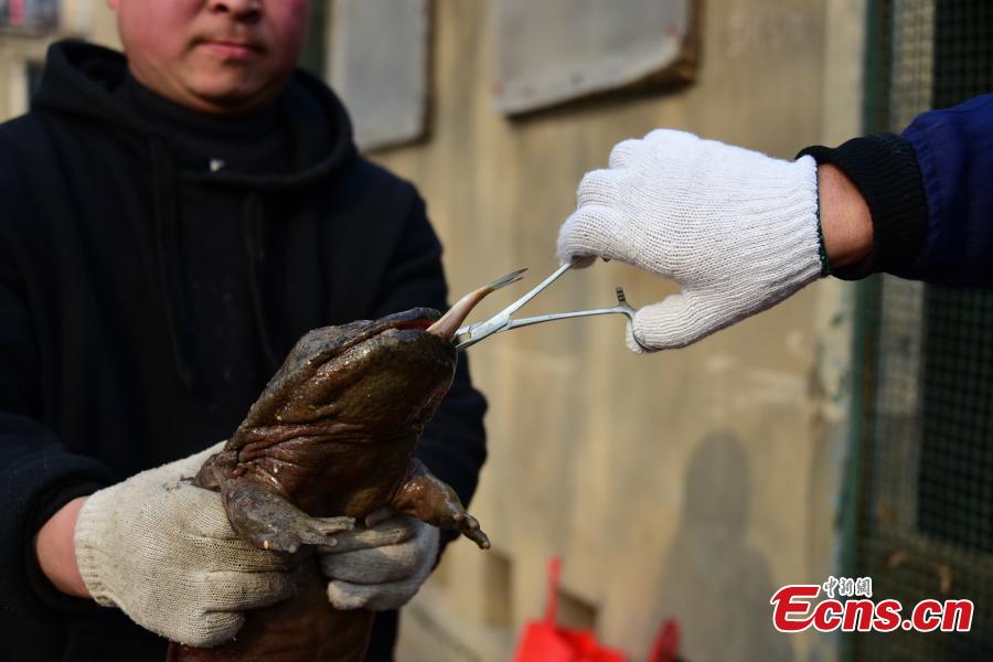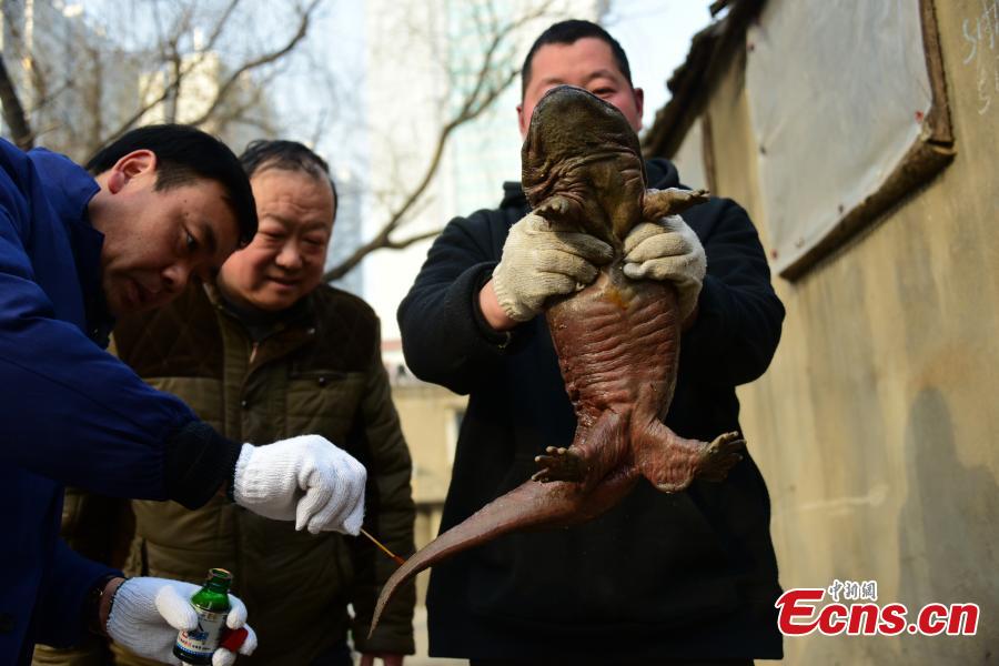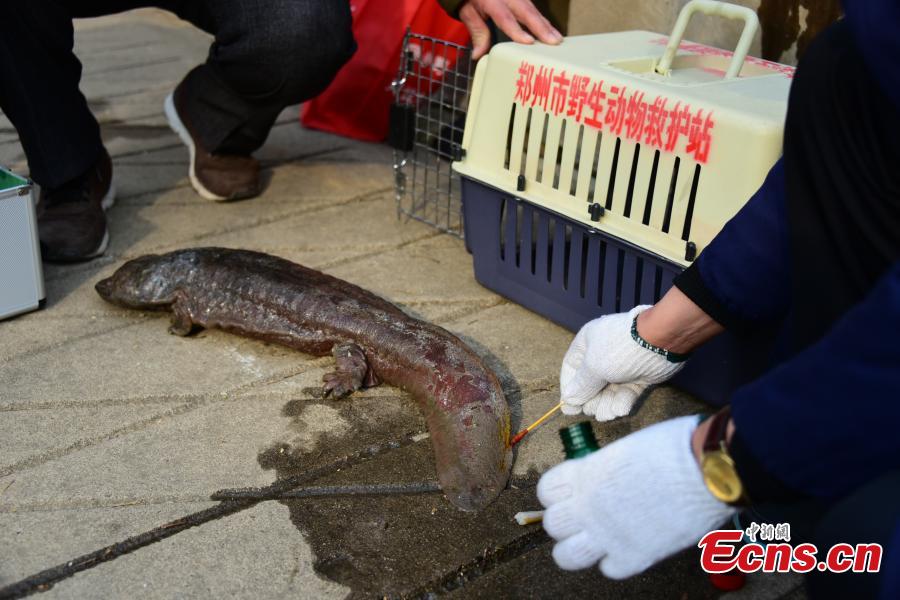 An expert checks an injured Chinese giant salamander after it was recused from a wastewater facility in Zhengzhou City, the capital of Central China’s Henan Province, Feb. 25, 2016. The 4-kilogram salamander, popularly known as the ‘baby fish’ in China, is thought to have been bred in captivity and entered a drain accidentally. (Photo/CFP)