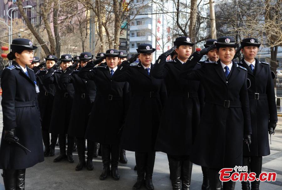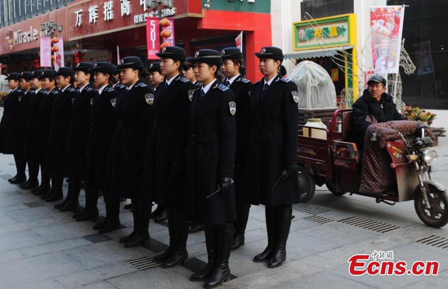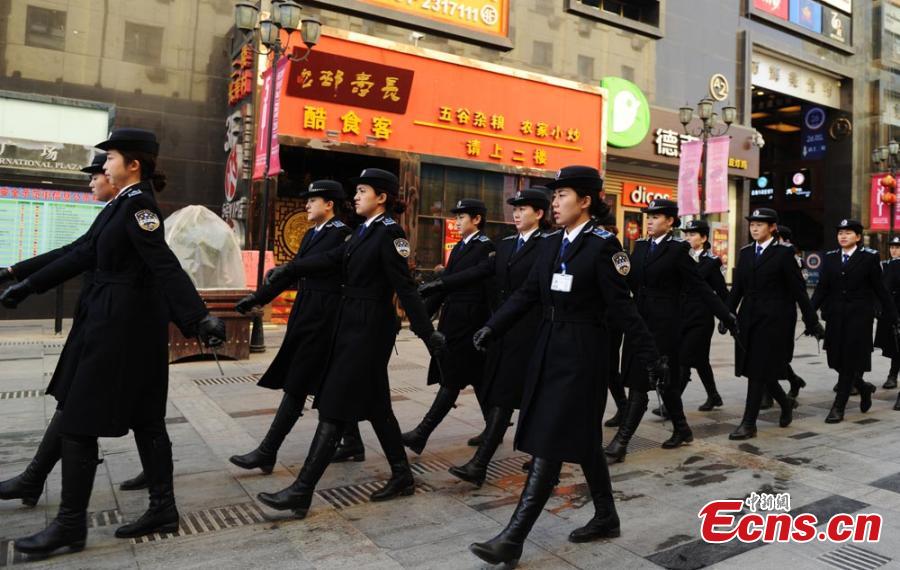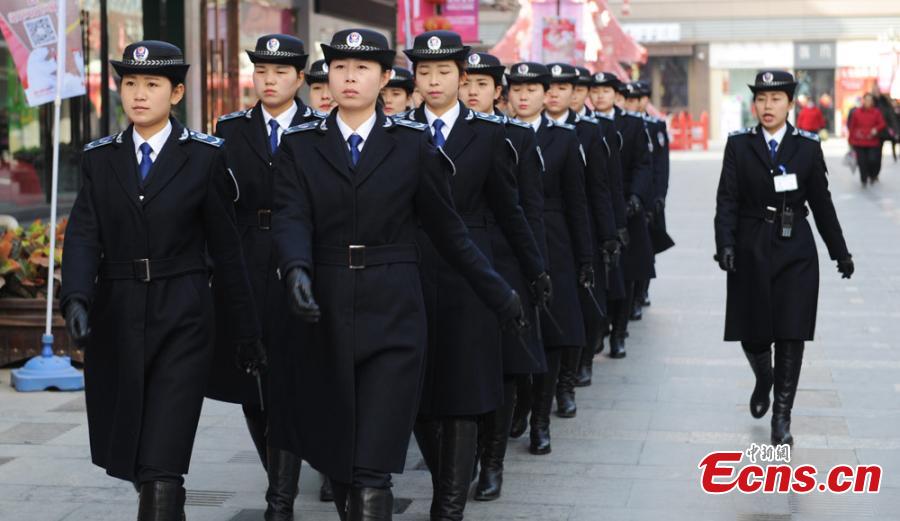 Urban management officials, or chengguan, march on a street in Lanzhou City, the capital of Northwest China’s Gansu Province, Feb. 25, 2016. The female chengguan, who had a change in uniform, are mainly responsible for enforcing city rules such as bans on hawking and unauthorized business activities. Frequent incidents of excessive violence against often poverty-stricken street vendors have given chengguanan a bad name and some see them as heartless, corrupt enforcers in China. Local authorities hope the well-dressed female chengguan will help reduce tension. (Photo: China News Service/Yang Yanmin)