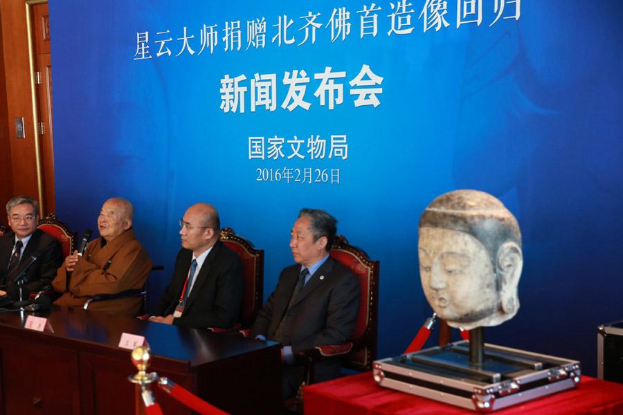 Abbot Hsing Yun, one of Taiwan's most influential monks, donated a Buddha head statue to Chinese mainland in Beijing on Feb 26, 2016. The head statue, carved during Northern Qi Dynasty (550-577 AD), originally belonged to Youju Temple in Lingshou county, North China's Hebei province. However, it was stolen and lost overseas in 1990s. Abbot Hsing Yun received the statue as a gift from his follower in 2014. The head statue will debut along with the body statue at National Museum of China on March 1, 2016. After the exhibition, the statue will be preserved in Hebei Museum in Shijiazhuang city, North China's Hebei province.