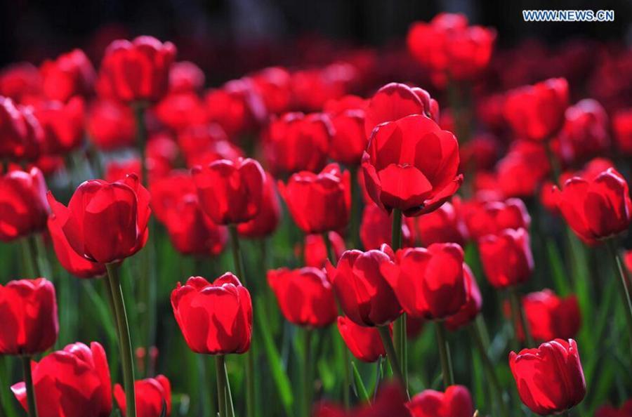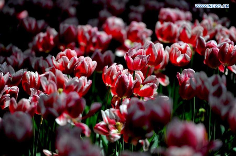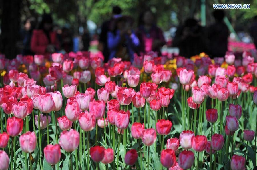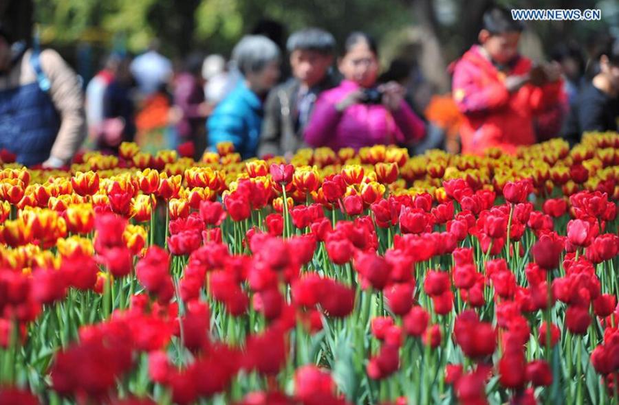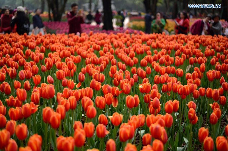 People view blooming tulips in Nanning, capital of south China's Guangxi Zhuang Autonomous Region, Feb. 27, 2016. (Photo/Xinhua)