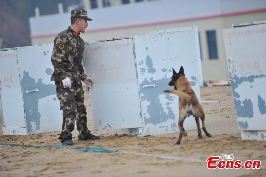 A sniffer dog performs for visitors on open day at a base in Nanning City, the capital of Southwest China’s Guangxi Zhuang Autonomous Region, Feb. 28, 2016. More than 200 residents visited the base that trains sniffer dogs for firefighting services. (Photo: China News Service/Hu Yan)