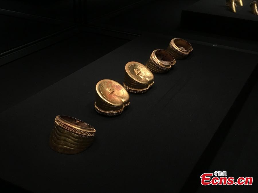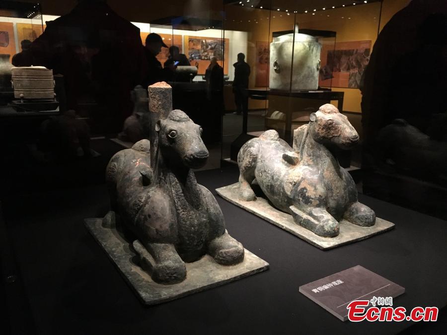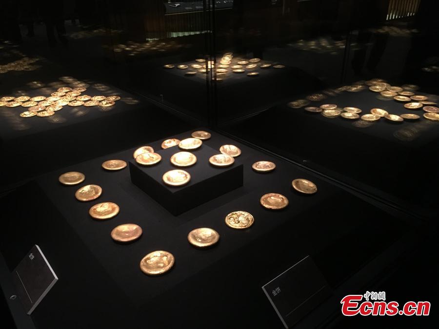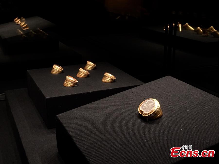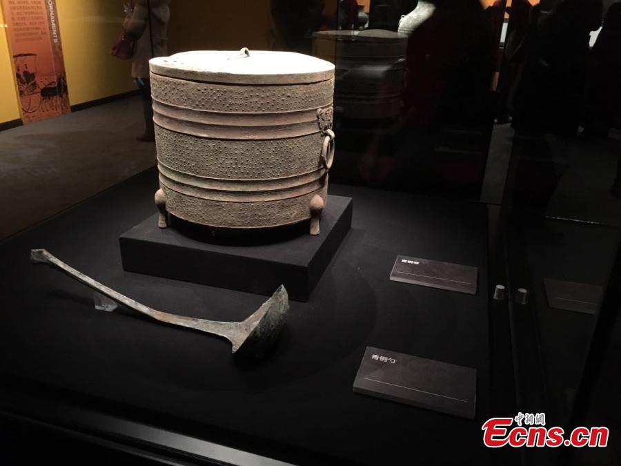 Artifacts unearthed from the Haihunhou tomb are on shown at the Capital Museum in Beijing on March 2, 2016. More than 400 artifacts, selected from 20,000 items unearthed from the tomb of Haihunhou (Marquis of Haihun) in east China's Jiangxi Province go on display from March 2 to June 2. The cemetery, dating back to the Western Han Dynasty (206 B.C.- 25 A.D.), covers some 40,000 square meters with eight tombs and a chariot burial site. Artifacts including gold items and a seal have confirmed that the main tomb of Haihunhou is that of Liu He, the grandson of Emperor Wu, the greatest ruler of the Han Dynasty, one of the most prosperous periods in China's history. (Photo: China News Service/ Zhai Lu)