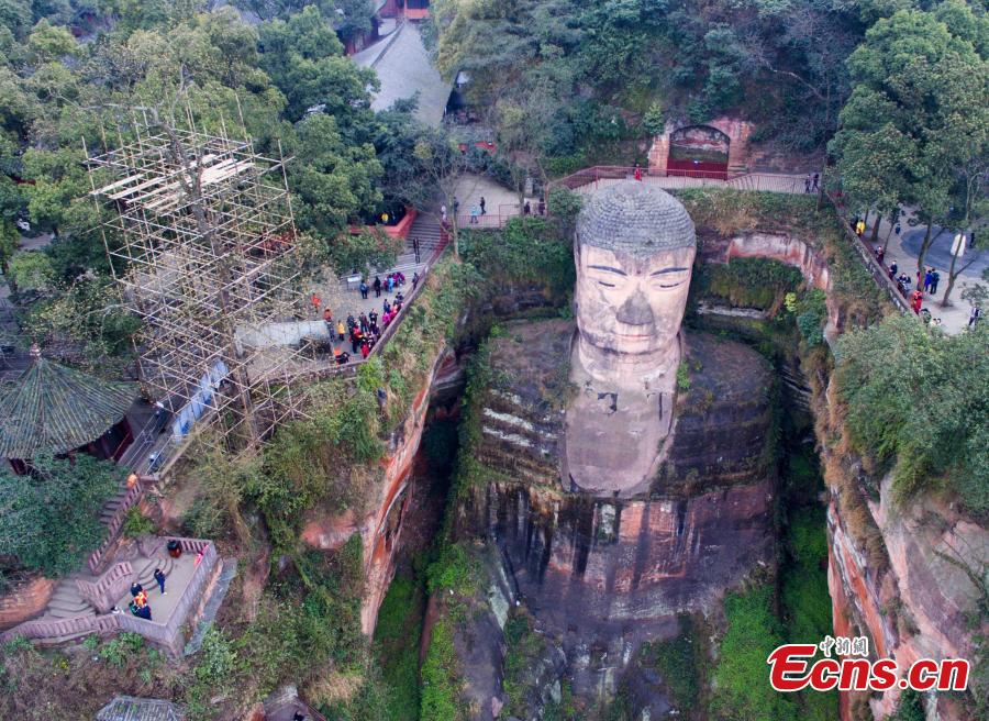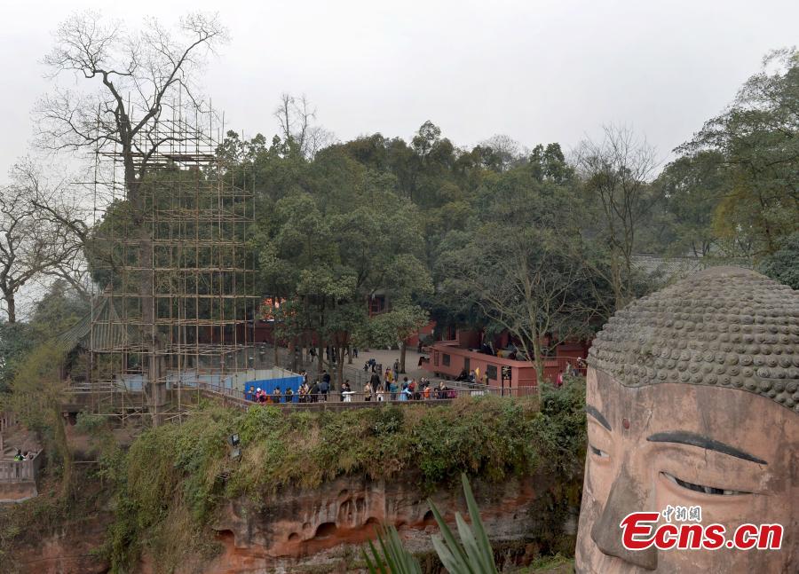 Authorities are attempting to manage pests on a Chinese pistache tree (Pistacia chinensis) overlooking the Leshan Giant Buddha in Leshan City, Southwest China’s Sichuan Province, March 2, 2016. The tree, which is 287 years old, has come under threat from pests in recent years and is in danger of falling down, said local authorities. The Leshan Giant Buddha is a 71-metre tall stone statue, built during the Tang Dynasty, and carved into a cliff face that lies at the confluence of rivers. (Photo/CFP)