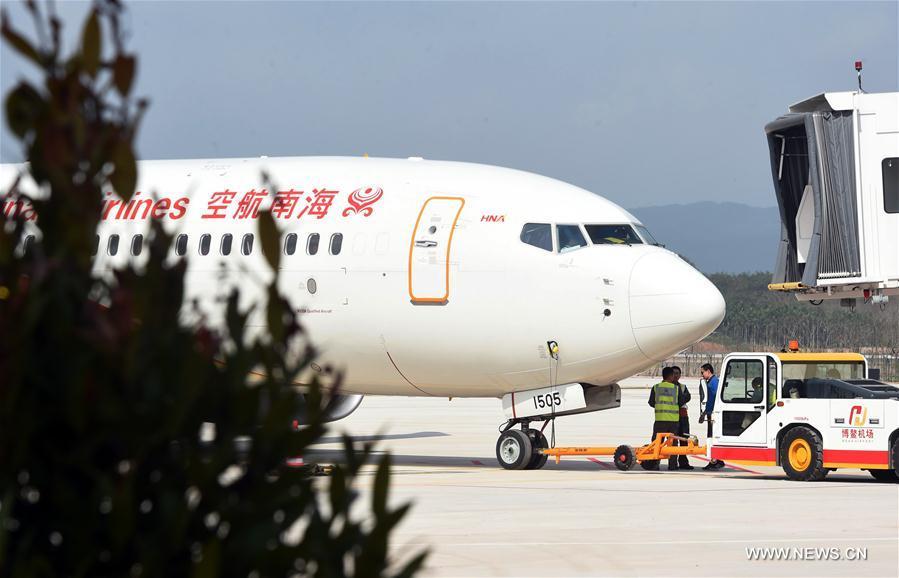 People prepare for a trial flight at the Boao airport in Qionghai, south China's Hainan Province, March 3, 2016. Boao airport, a supporting project for Boao Forum for Asia (BFA), is expected to begin trial operations on March 8 to serve this year's conference. (Photo: Xinhua/Yang Guanyu)