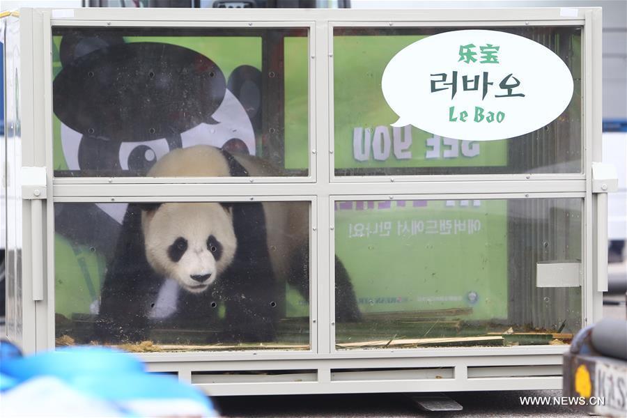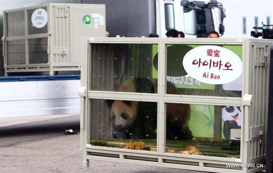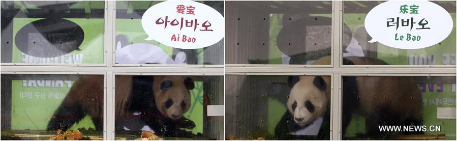 The combo photo shows giant pandas named Ai Bao (L) and Le Bao at the Incheon International Airport in Incheon, South Korea, March 3, 2016. A pair of Chinese giant pandas arrived in South Korea Thursday on a 15-year lease, marking the first time in 22 years that the endangered bear species enters the South Korean territory for joint research purpose. (Photo: Xinhua/Yao Qilin)