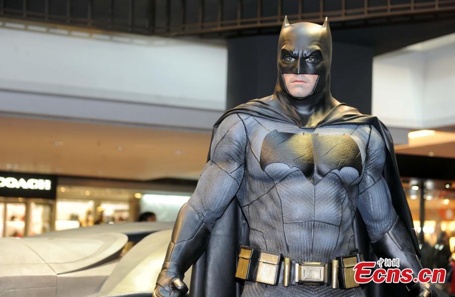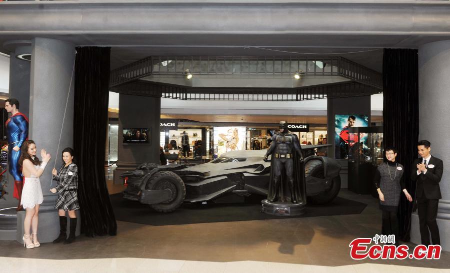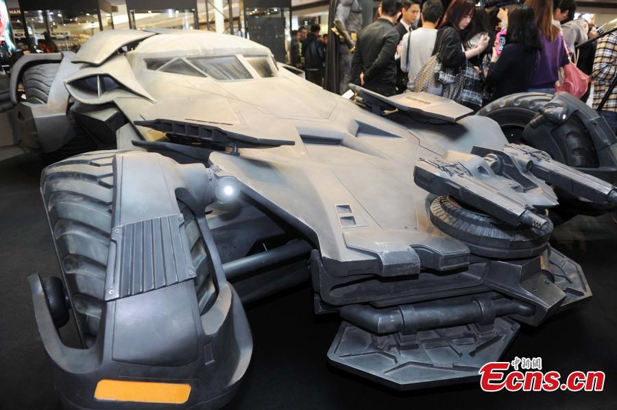 A Batmobile, one of the centerpiece props in Batman v Superman: Dawn of Justice, is on display to promote the film in Hong Kong, March 3, 2016. The car is the same size as the one used in the film and weighs about one ton. (Photo: China News Service/Tan Daming)