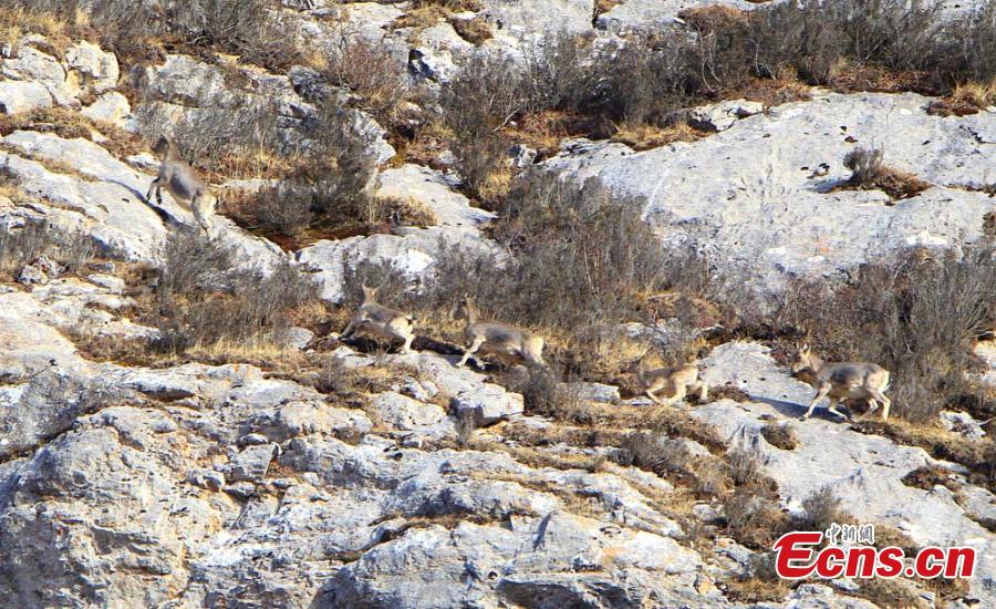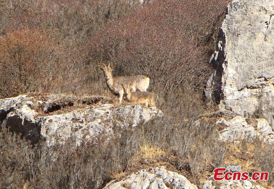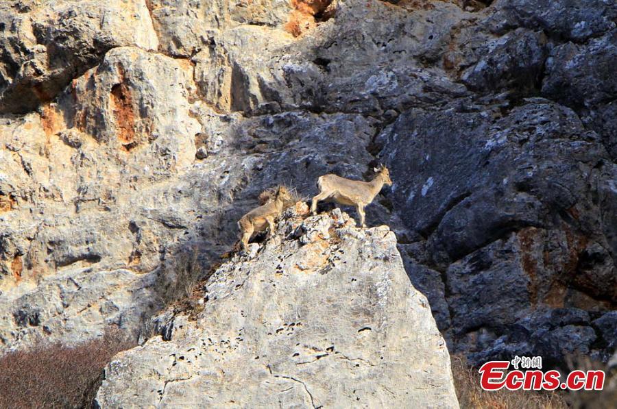 Blue sheep, or pseudois nayaur, at the Gahai-Zecha National Nature Reserve in Northwest China’s Gansu Province, March 3, 2016. Nearly 2,000 blue sheep now live in the nature reserve due to enhanced protection in recent years. They live on mountains 3,500 to 5,000 meters above sea level and excel at maneuvering on cliffs. (Photo: China News Service/Zhang Yong)