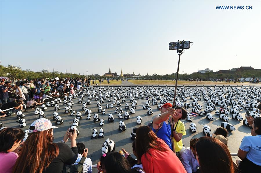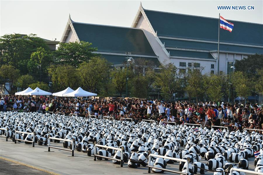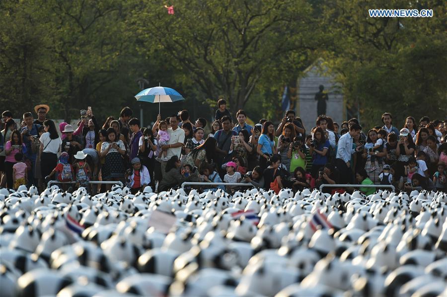 A swarm of spectators watch papier-mache pandas during an exhibition of the papier-mache artwork "1600 Pandas" at the Sanam Luang square in Bangkok, Thailand, March 4, 2016. "1600 Pandas", a papier-mache artwork created in 2008 by French artist Paulo Grangeon for the World Wildlife Fund (WWF), began its Thailand exhibition tour on Friday in an initial flash-mob show at Bangkok's Sanam Luang square that lasted for three hours. The 1,600 paper pandas will be shown at nine more stops in Bangkok and Ayutthaya before the exhibition tour concludes on April 10. (Photo:Xinhua/Li Mangmang)