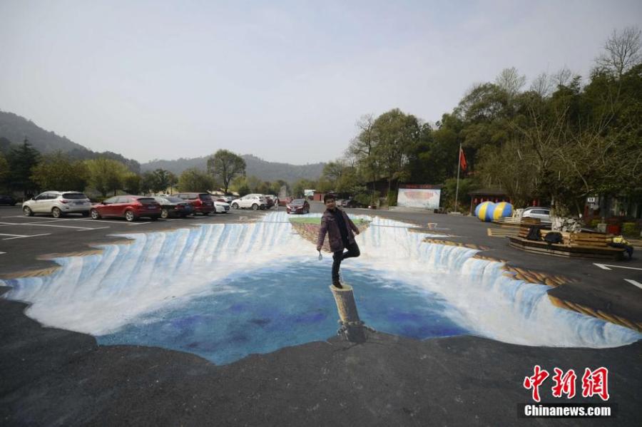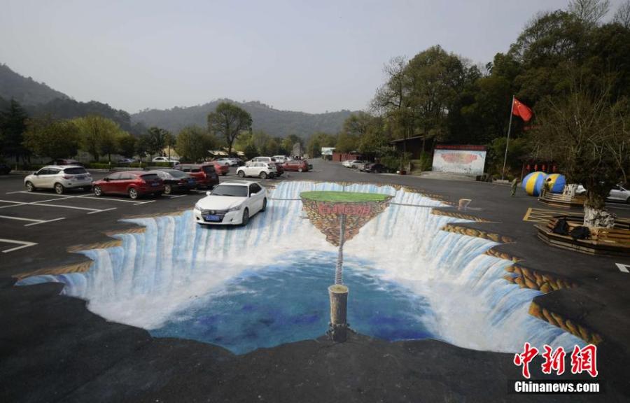 A 3D painting of a giant waterfall appears at a parking lot in Changsha, Hunan province, central China on Sunday, March 6, 2016. The 500-squre meter painting gives the illusion of height and the perception of depth of the waterfall to people observing the artwork at street level, and has been attracting many spectators who are fascinated by the optical trick. (Photo: China News Service/Yang Huafeng)