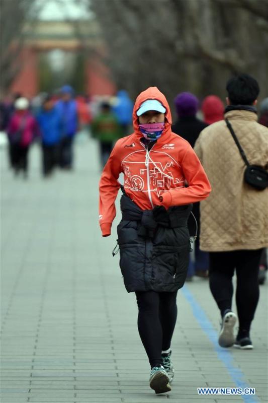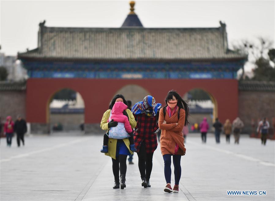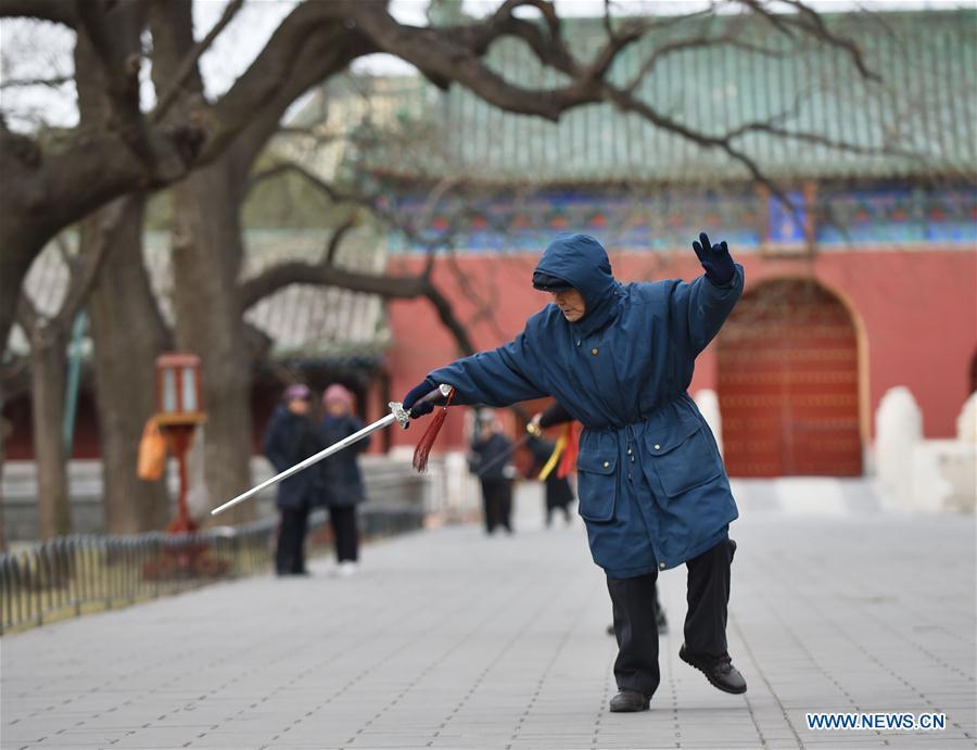 Residents wearing thick coats walk with their birds at the Tiantan Park in Beijing, capital of China, March 8, 2016. Temperature fell sharply in Beijing as the lowest temperature hit below zero centigrade. (Xinhua/Li Wen)