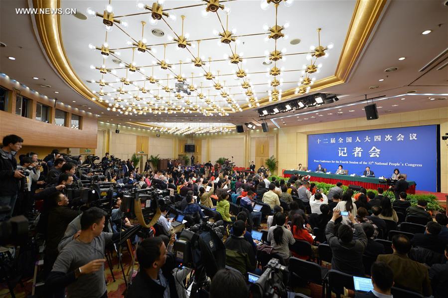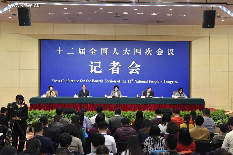 Li Bin, minister in charge of the National Health and Family Planning Commission, answers questions at a press conference on China's two-child policy on the sidelines of the fourth session of China's 12th National People's Congress in Beijing, capital of China, March 8, 2016. Ma Xiaowei and Wang Peian, vice directors of the commission, also attended the press conference. (Xinhua/Xue Yubin)