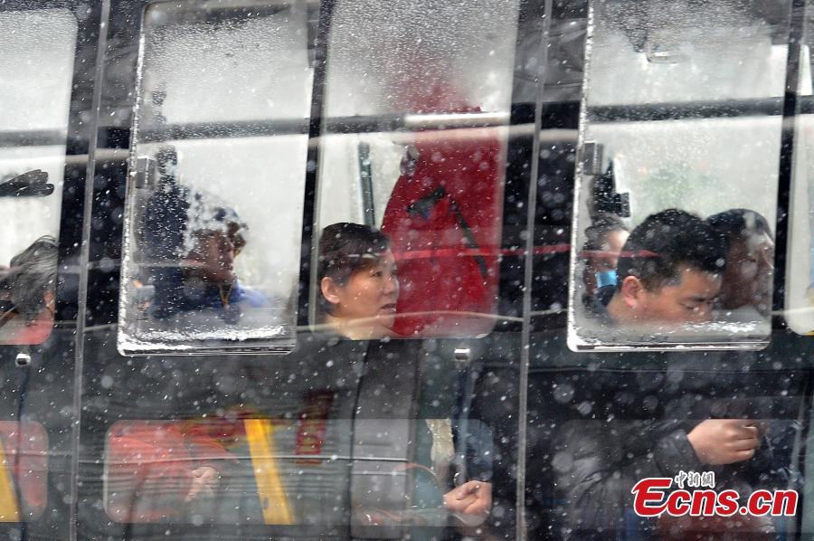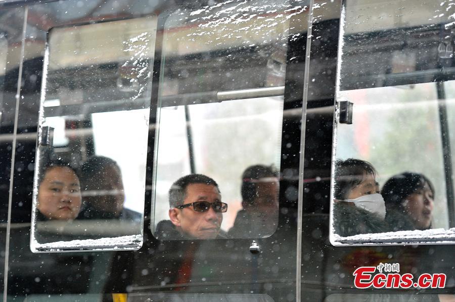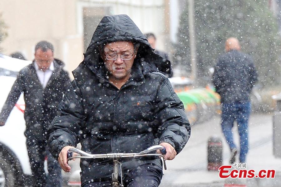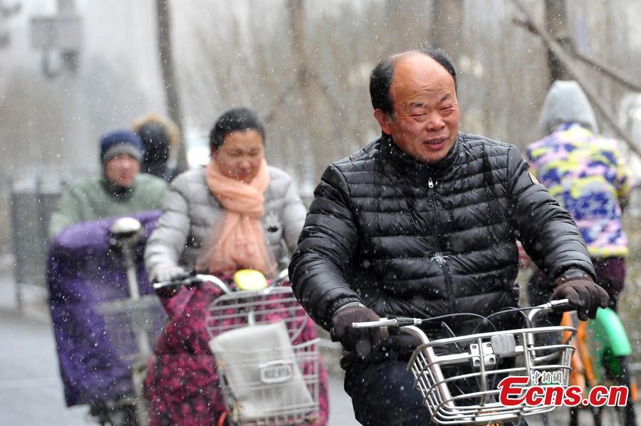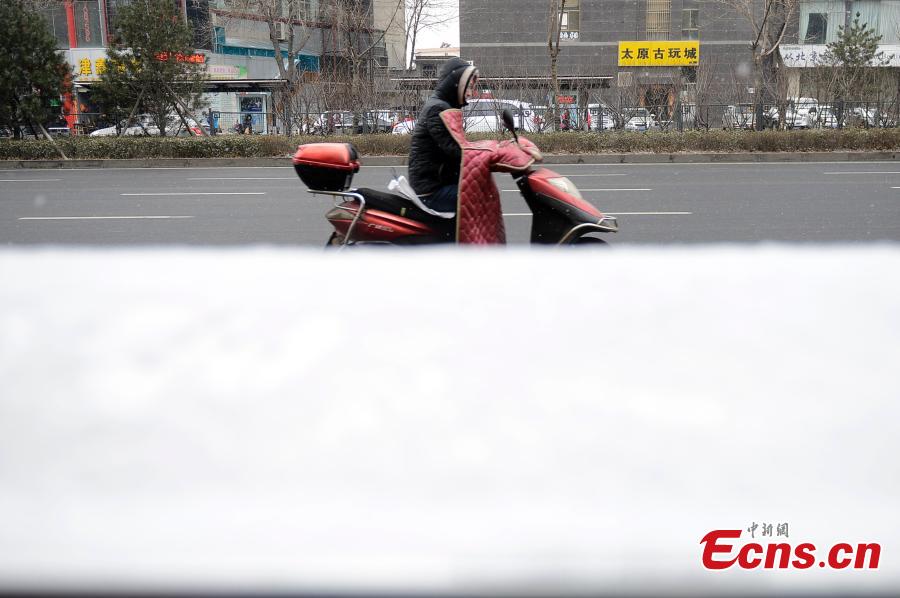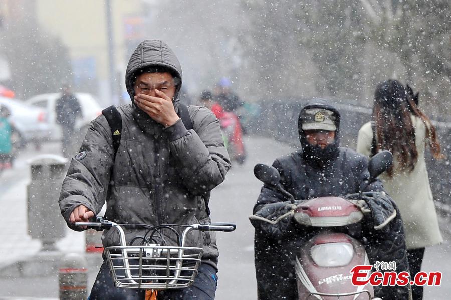 Snow falls in Taiyuan City, the capital of North China’s Shanxi Province, March 9, 2016. The National Meteorological Center on Tuesday issued a yellow alert for an incoming cold front that will affect most parts of the country. China has a four-tier warning system for severe weather, with red being the most serious, followed by orange, yellow and blue. (Photo: China News Service/Wei Liang)