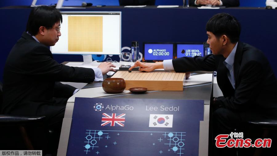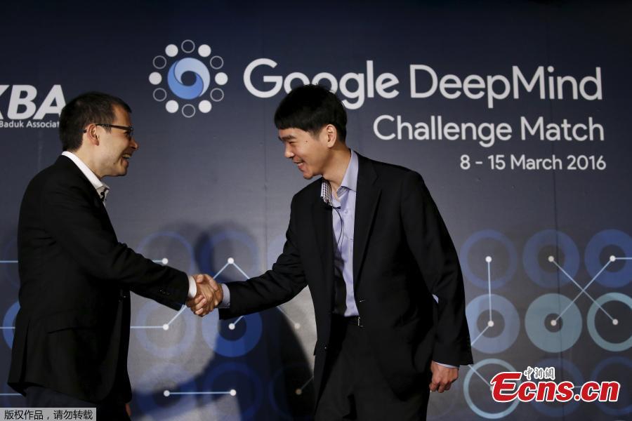 South Korean professional Go player Lee Sedol, right, shakes hands with CEO of Google DeepMind Demis Hassabis, left, during a press conference ahead of the Google DeepMind Challenge Match in Seoul, South Korea, March 8, 2016. Lee Sedol and Google's artificial intelligence program, AlphaGo will play in a five game matches from March 9 to March 15. Computers eventually will defeat human players of Go, but the beauty of the ancient Chinese game of strategy that has fascinated people for thousands of years will remain, the world champion of the game said Tuesday. (Photo provided to China News Service)