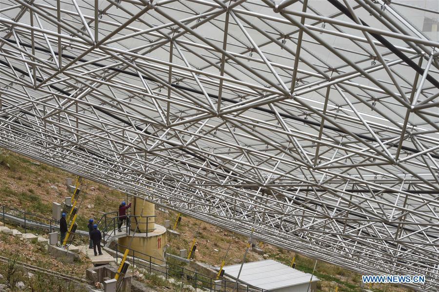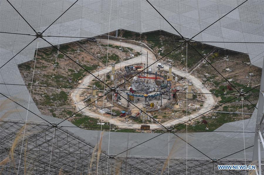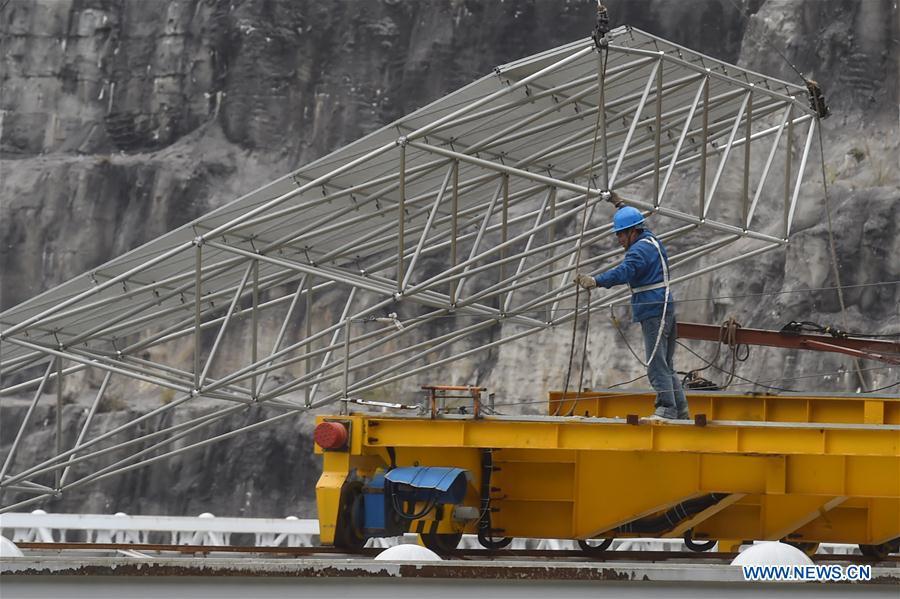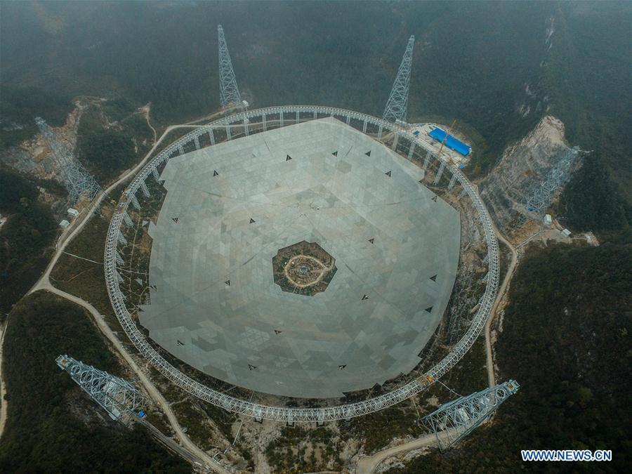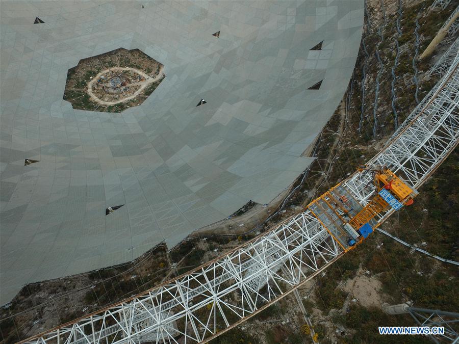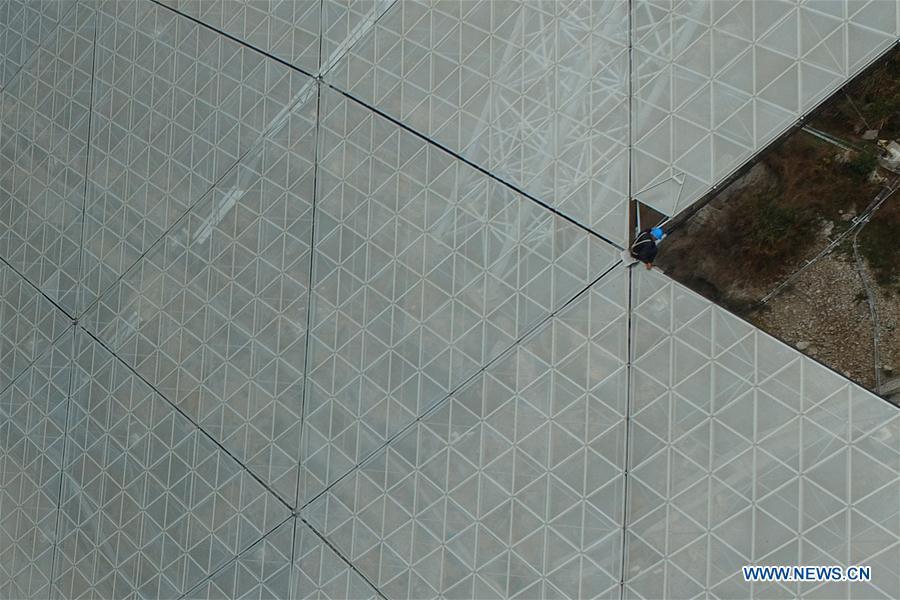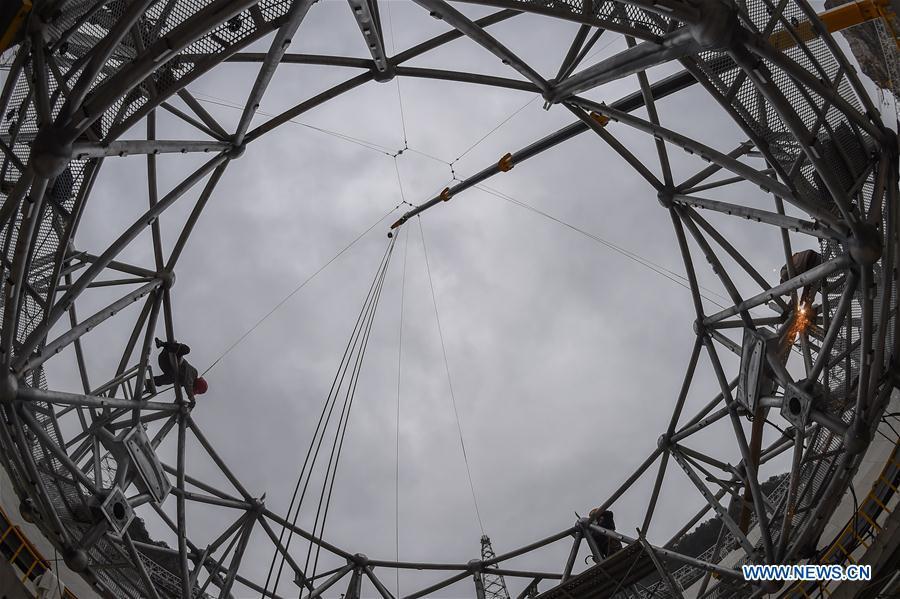 Workers assemble the single-aperture spherical telescope "FAST" in Pingtang County, southwest China's Guizhou Province, March 9, 2016. A total of 3,492 reflector panels, an equilateral triangle with a side length of 11 meters each, have been installed on the frame. When it is completed in 2016, the five hundred meter aperture spherical telescope (FAST) will be the world's largest, overtaking Puerto Rico's Arecibo Observatory, which is 300 meters in diameter. (Xinhua/Ou Dongqu)