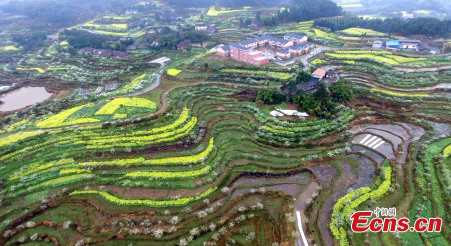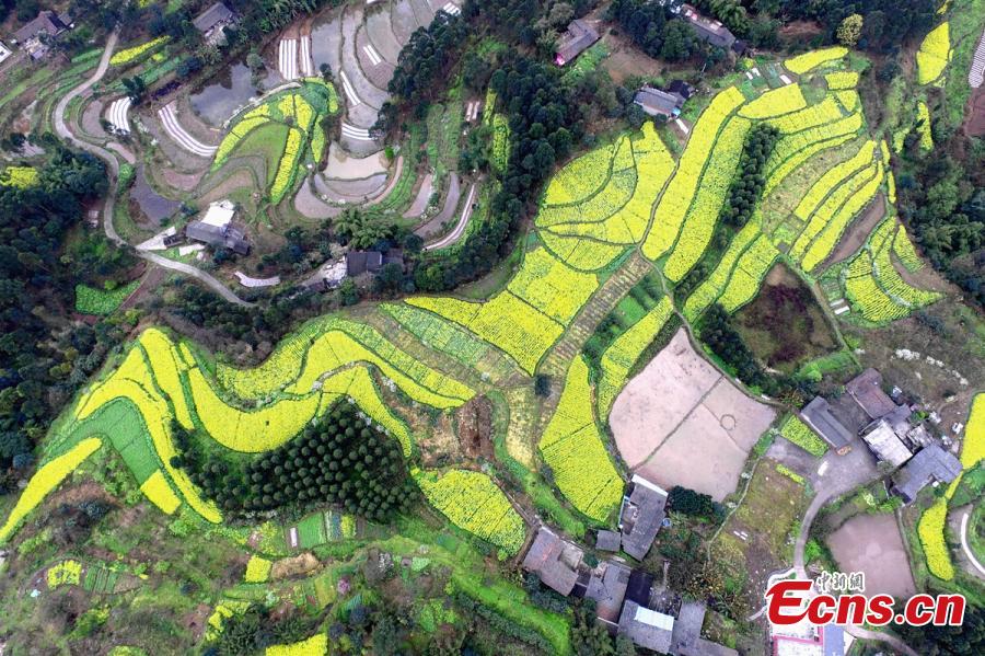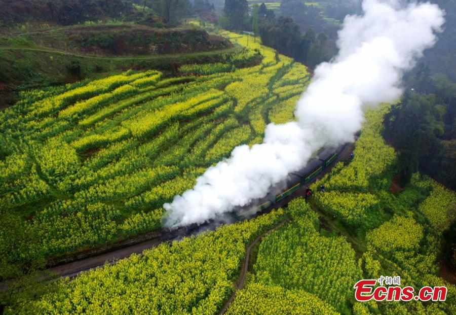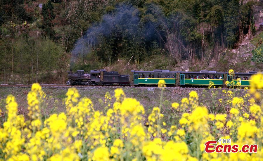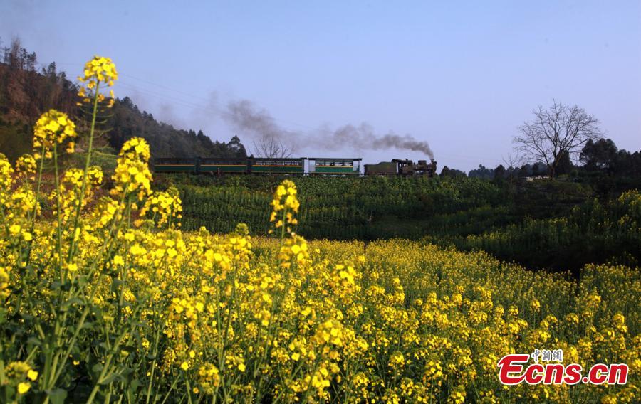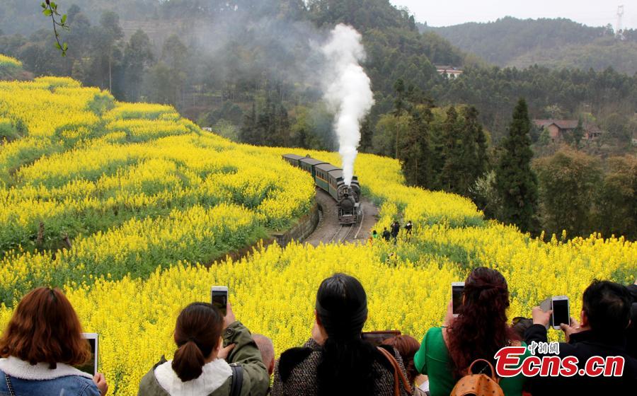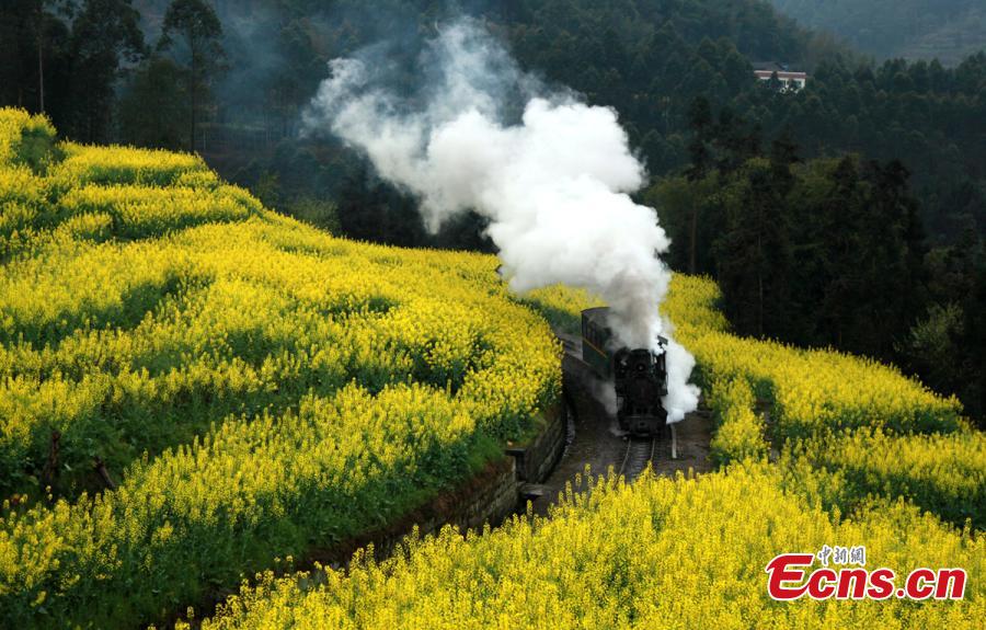 A steam train runs through fields planted with rapeseed flowers in full bloom in Qianwei County, Southwest China’s Sichuan Province. The county has attracted many visitors as temperatures rise and flowers begin to bloom. (Photo: China News Service/Liu Zhongjun)