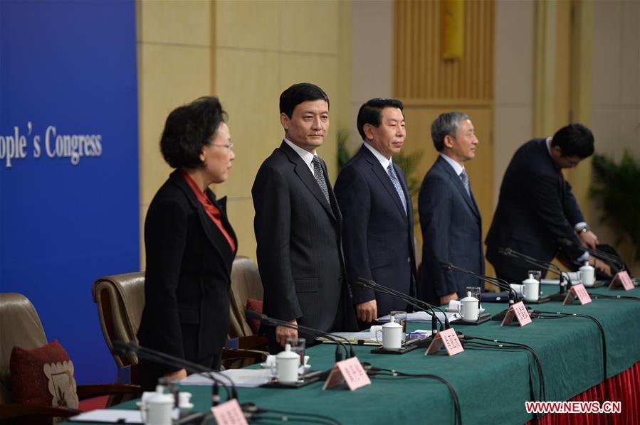 Chief of the State-owned Assets Supervision and Administration Commission of the State Council (SASAC) Xiao Yaqing (2nd L, back), SASAC Deputy Chief Zhang Xiwu (2nd R, back), SASAC Deputy Chief Huang Danhua (1st L, back) and SASAC Deputy Secretary General and Spokesperson Peng Huagang (1st R, back) give a press conference on the reform of state-owned enterprises on the sidelines of the fourth session of the 12th National People's Congress in Beijing, capital of China, March 12, 2016. (Xinhua/Chen Junqing)
