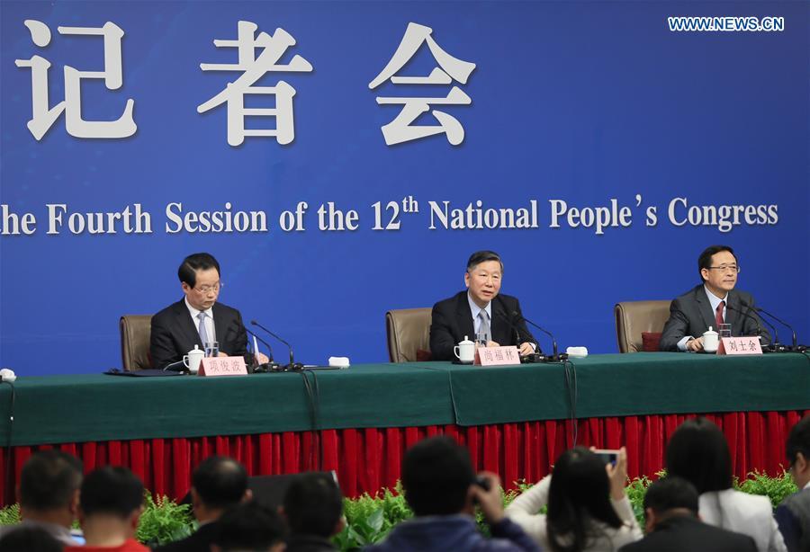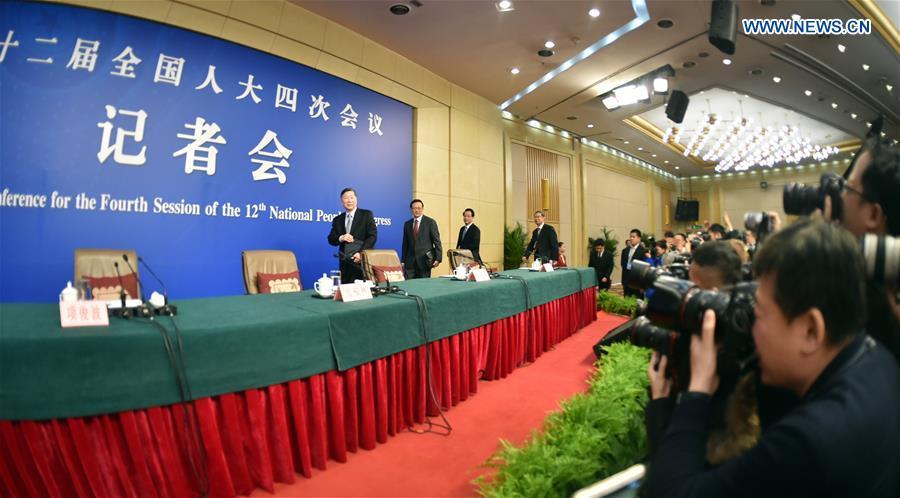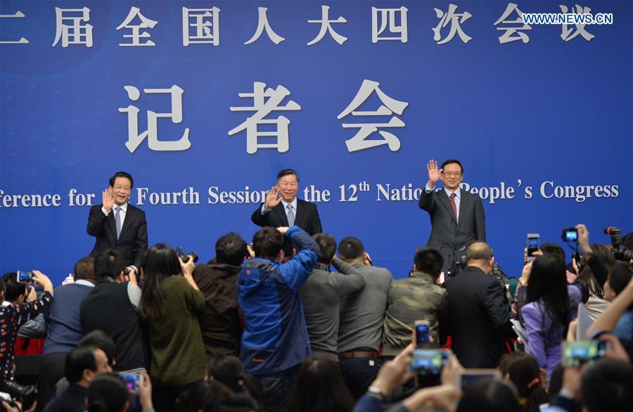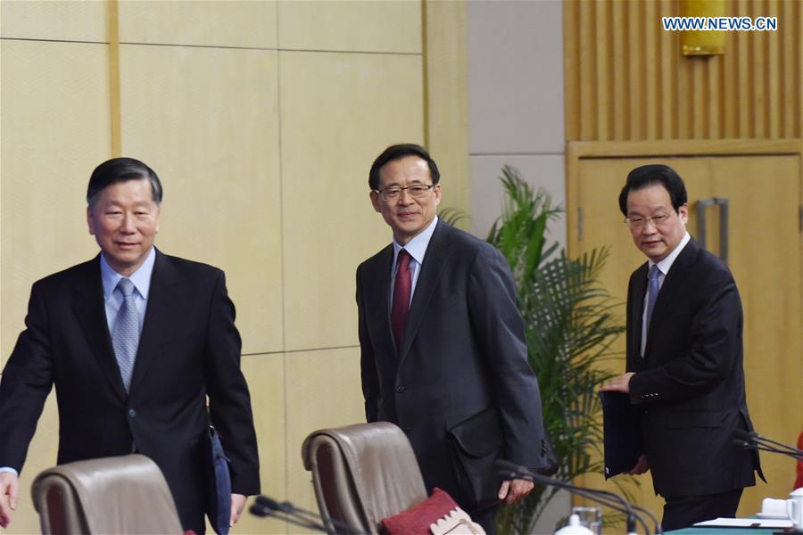Chairman of the China Banking Regulatory Commission Shang Fulin, Chairman of the China Securities Regulatory Commission Liu Shiyu and Chairman of the China Insurance Regulatory Commission Xiang Junbo arrive for a press conference on the sidelines of the fourth session of the 12th National People's Congress in Beijing, capital of China, March 12, 2016. (Xinhua/Zhao Yingquan)