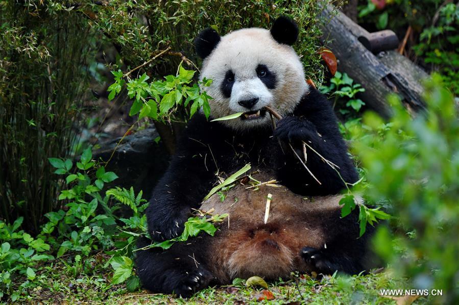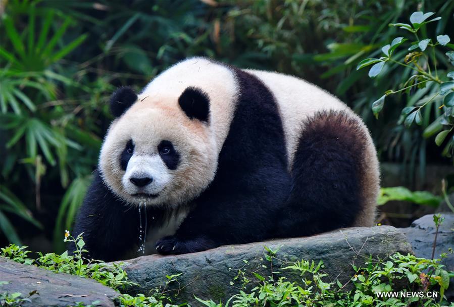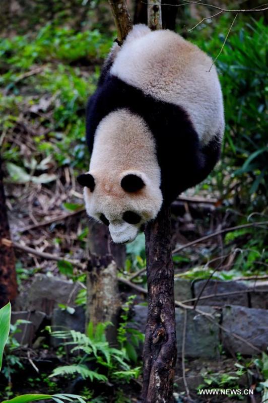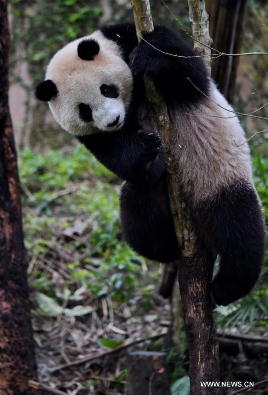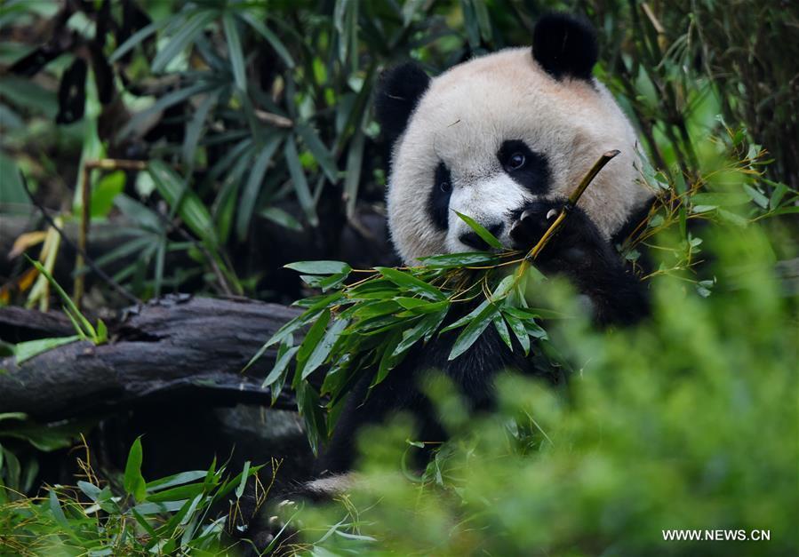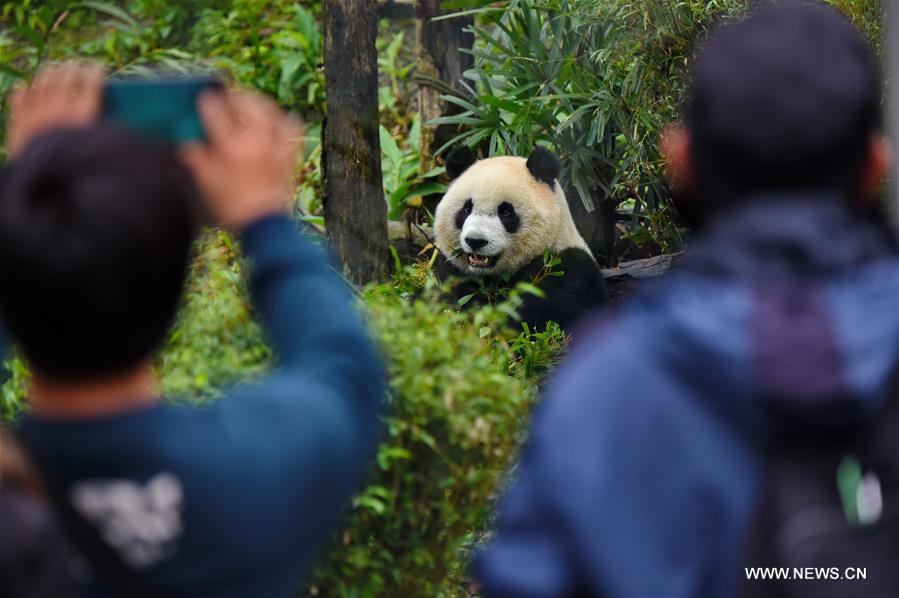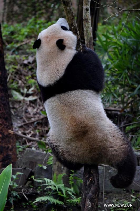Giant panda "Yuanzai" eats branches at the Taipei Zoo in Taipei, southeast China's Taiwan, March 13, 2016. More than five million people have visited Yuanzi since his debut Jan. 6, 2014. (Photo: Xinhua/Zhang Guojun)