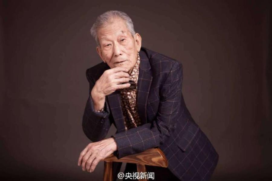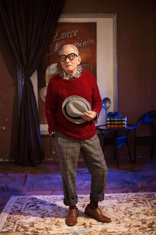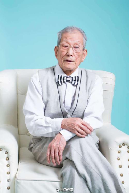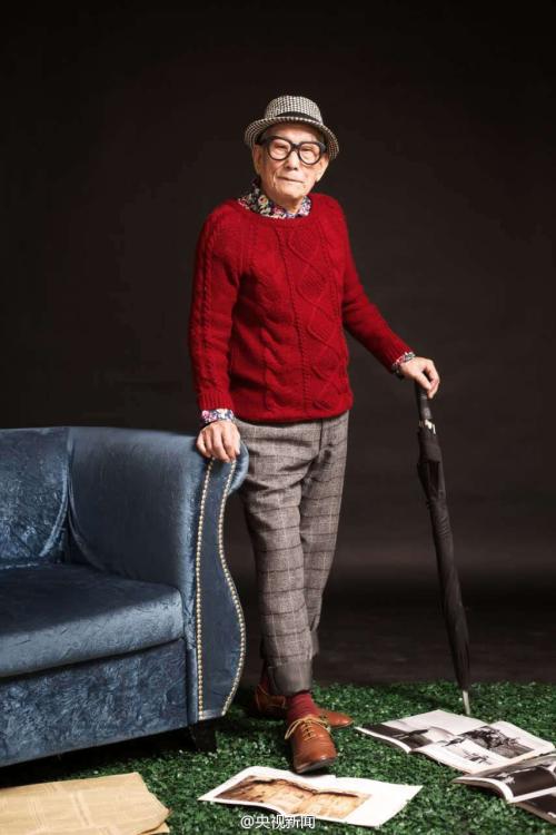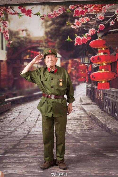 Ma Zhiying, 96 years old, poses for a photo at the suggestion of his granddaughter. It’s a first for Ma, who is generally known as a serious and disciplined veteran who fought in the war in 1936, to put on clothes that people of his age usually never wear and strike different poses. (Photo/Weibo of CCTV)