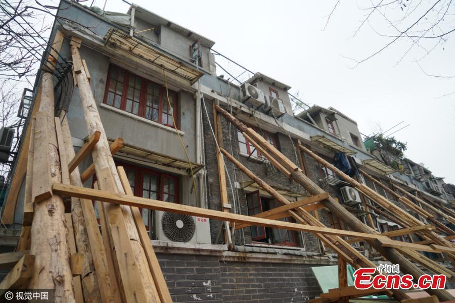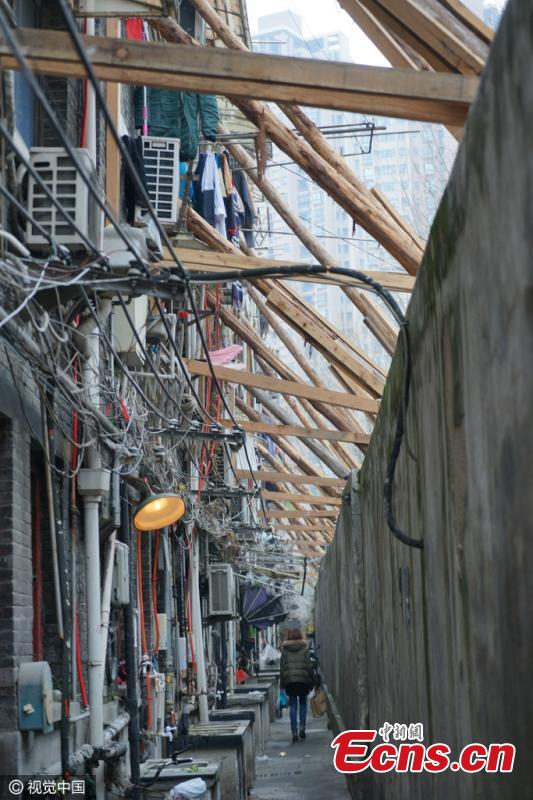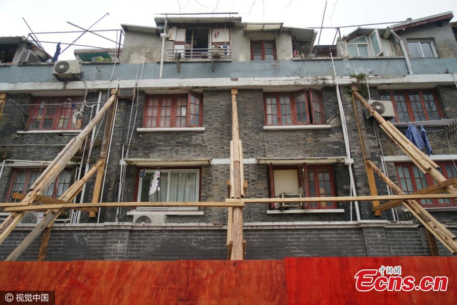 An old house is being reinforced by tens of wooden sticks in Huangpu District, Shanghai Municipality, March 13, 2016. The brick-wood buildings have a history of over 90 years and suffer from cracks and tilts due to the nearby forceful construction, a source said. (Photo/IC)