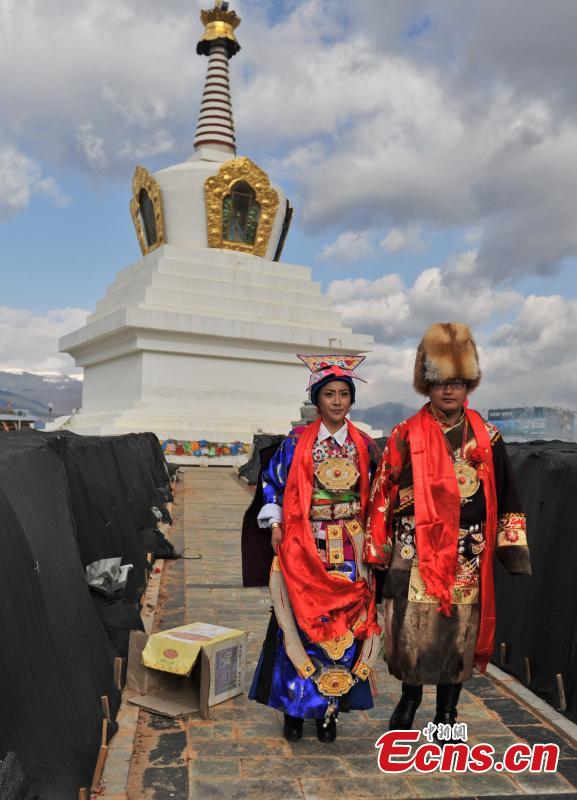 A traditional Tibetan wedding ceremony is held in Shangri-La City, Diqing Tibetan Autonomous Prefecture, Southwest China’s Yunnan Province, March 13, 2016. At around 7am, the groom led a parade to greet his bride at her village. With well-wishes and songs, the bride then accompanied the groom to his house. (Photo: China News Service/Ren Dong)