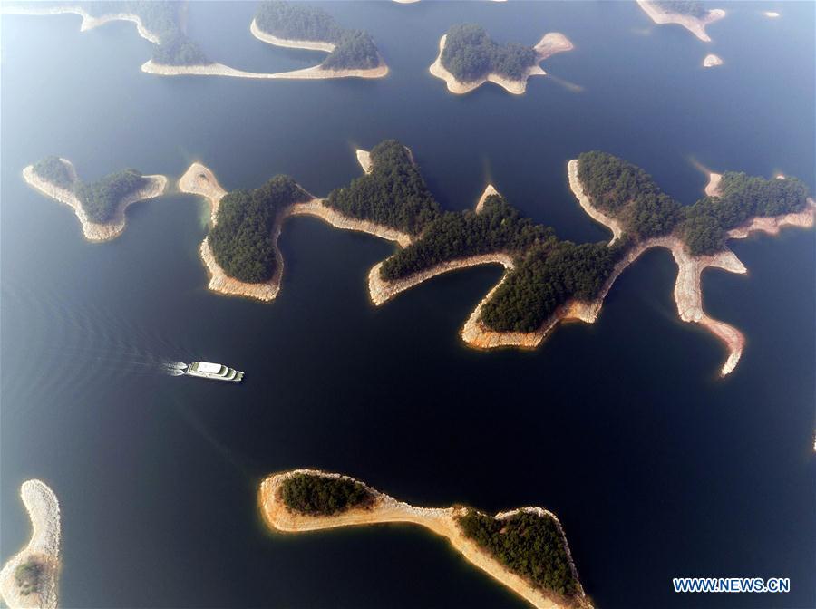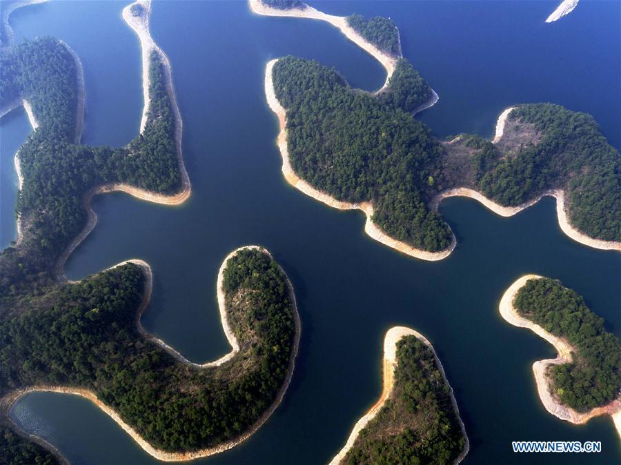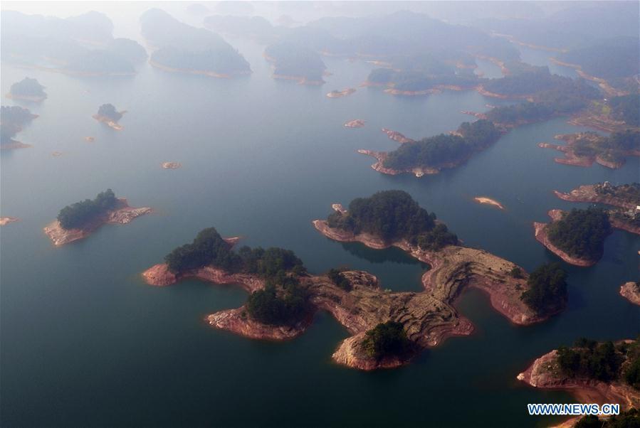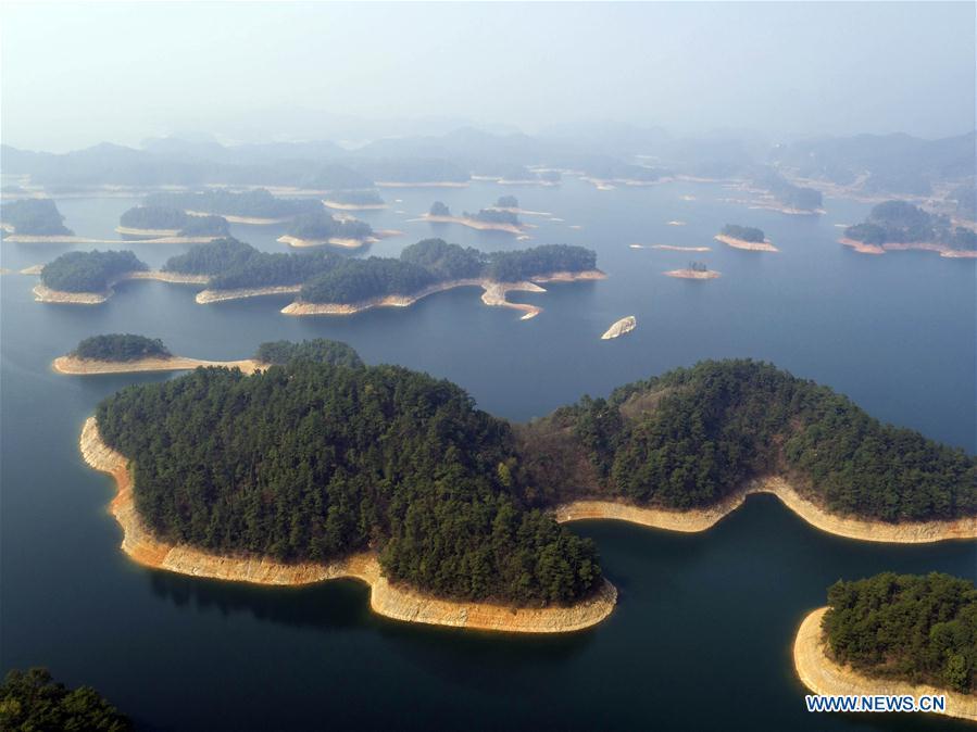 Photo taken on March 15, 2016 shows an aerial view of the Qiandao Lake, or Thousand-Island Lake, in Chun'an County of Hangzhou, east China's Zhejiang Province. With 1,078 islands scattered across the lake, Qiandao Lake is a famous spot for sightseeing in China. (Photo: Xinhua/Zhang Xiaoli)