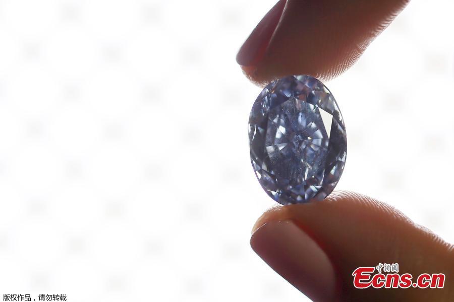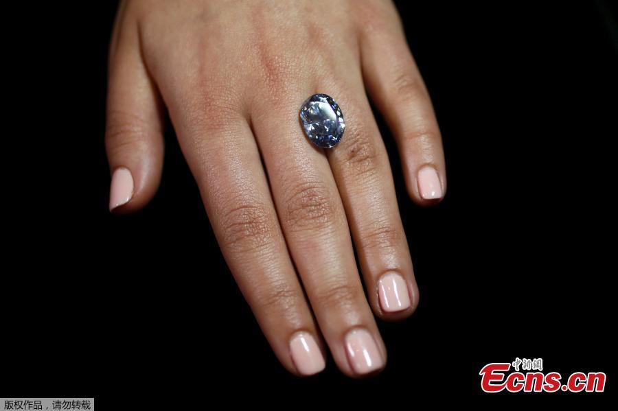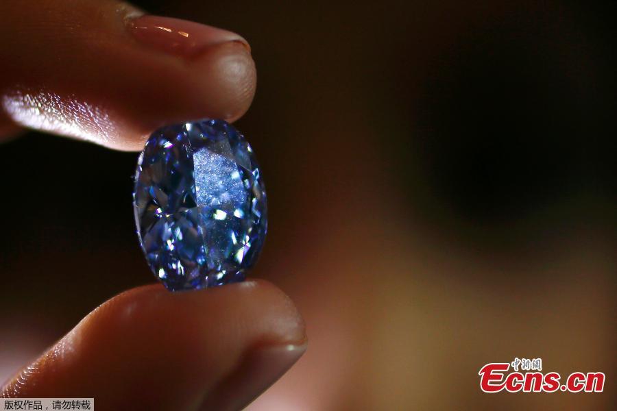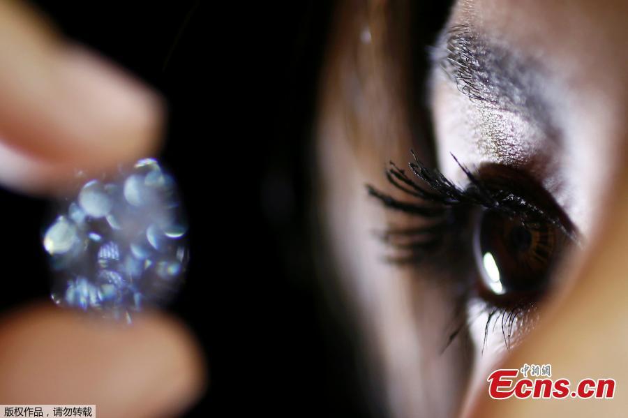 An employee disdplays a 10.10 carat internally flawless blue diamond at Sotheby's auction house in central London, Britain March 15, 2016. The oval fancy vivid blue diamond is expected to fetch between $30-35 million at the auction house's Magnificent Jewels and Jadeite auction in Hong Kong on April 5.(Photo/Agencies)
