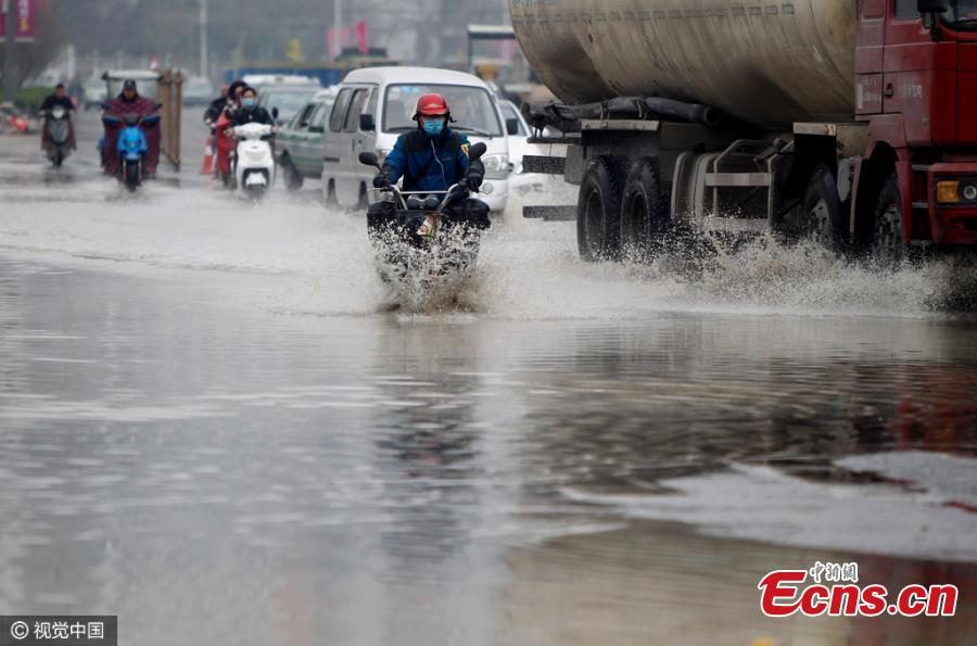 A street floods after a heat supply pipe bursts in Zhengzhou City, the capital of Central China’s Henan Province, May 15, 2016. On the last day of the winter heat supply, local authorities tested the heat supply pipe network by increasing the pressure in order to identify and repair the weakest section, which will burst under the pressure. The heating season begins on November 15 and ends on March 15. (Photo/CFP)