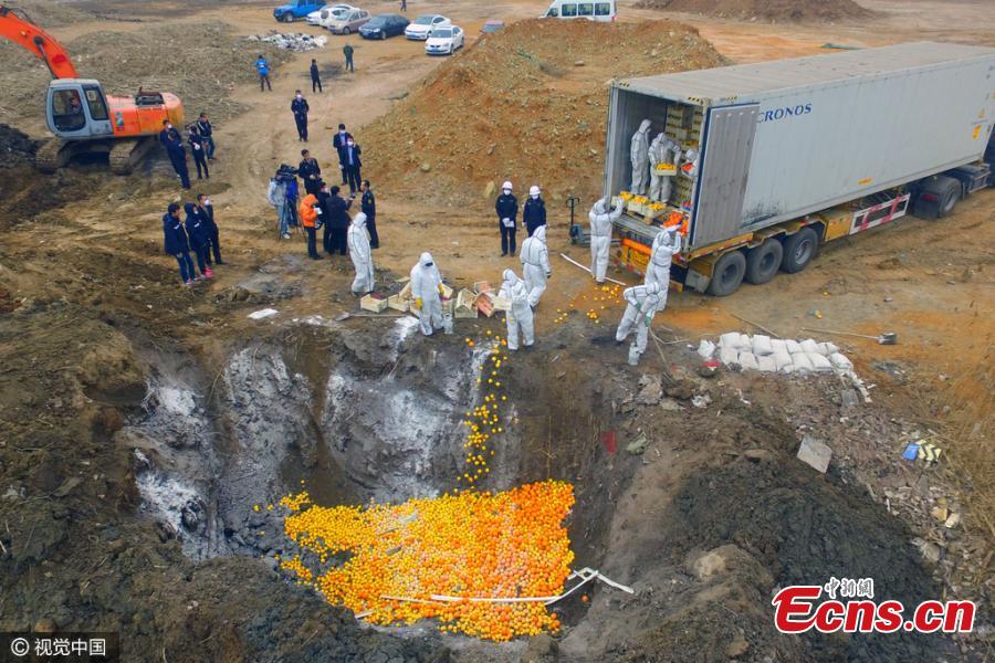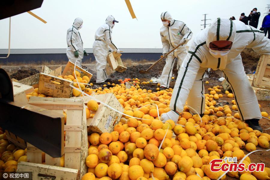 Lemons and oranges imported from Spain are destroyed in North China’s Tianjin Municipality, March 15, 2016. The fruit, worth 14,000 euros and weighing 20 tons, failed to pass quarantine and inspection tests at the Tianjin port. (Photo/CFP)