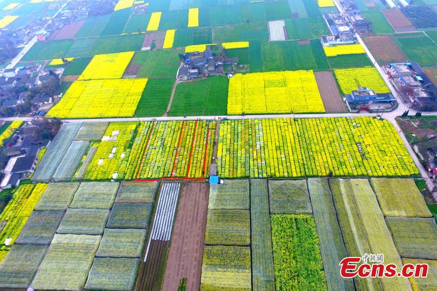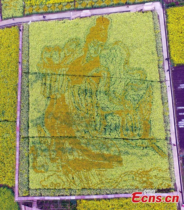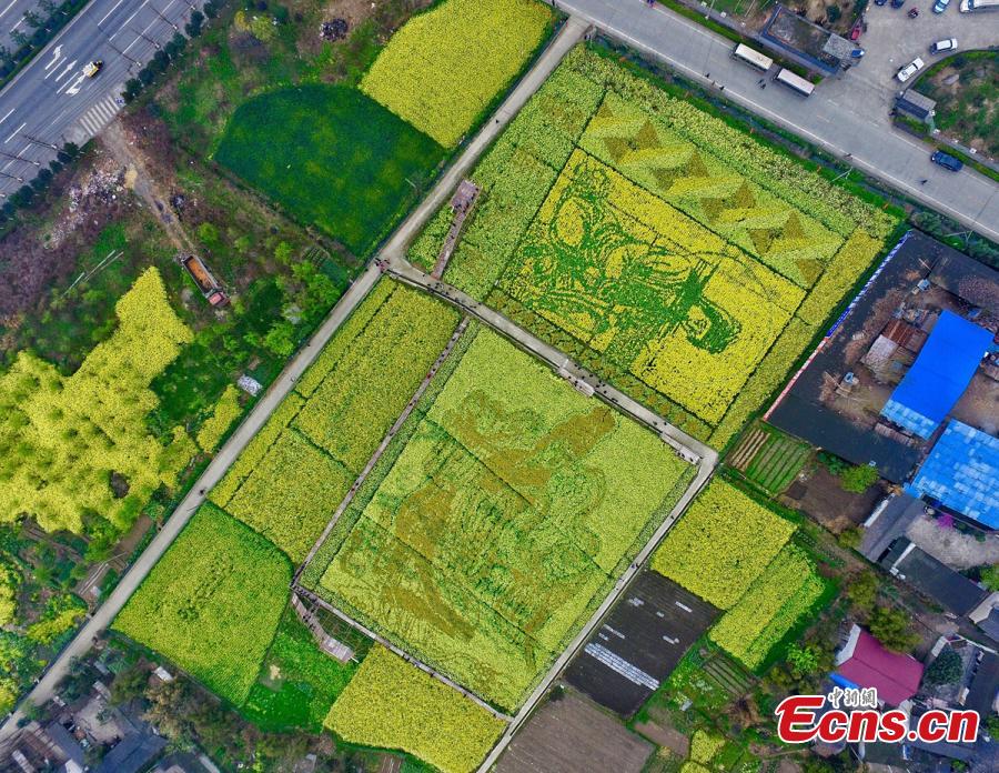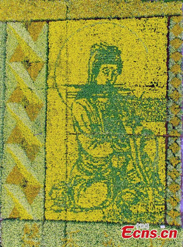 An aerial view of rapeseed flowers at an agricultural science park in Shifang City, Southwest China’s Sichuan Province, March 15, 2016. Park manager Li Xiaonan said rapeseed flowers of different colors had been cultivated there and the next goal was to have blue ones. Patterns of the Chinese equivalent of the bodhisattva known as Guanyin and fairies had also been with the flowers to attract visitors to the park, which covers an area of four hectares. (Photo: China News Service/Liu Zhongjun)