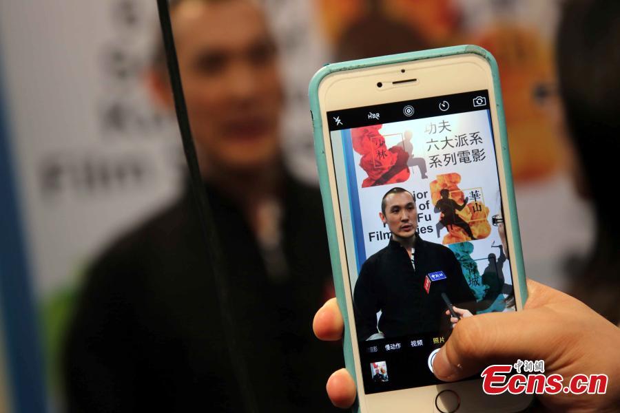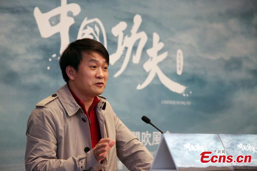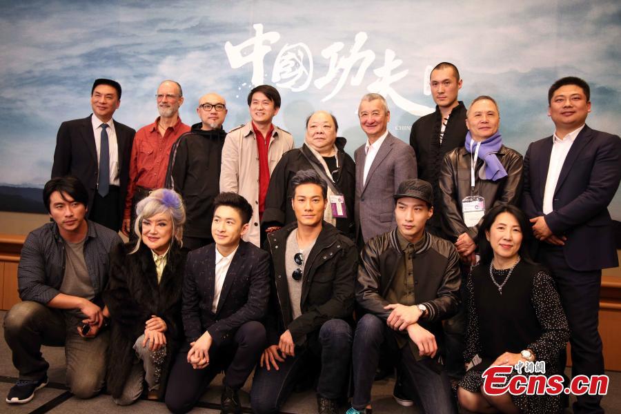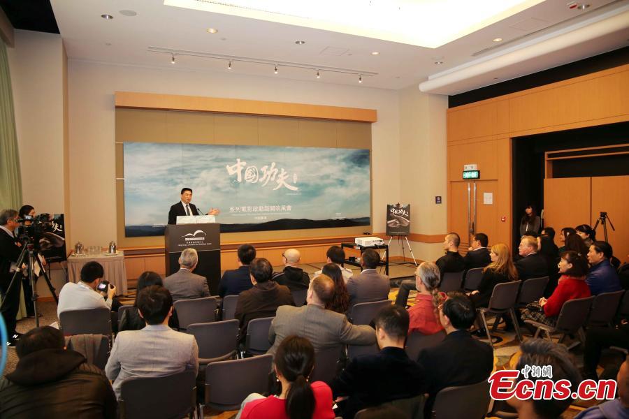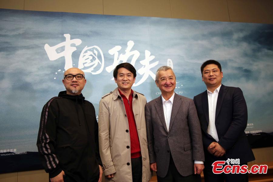 Hong Kong scriptwriter Zhang Tan (L), Nanhai Film Co Ltd General Manager Lv Zhenya (2nd, L), and Salon Films (Hong Kong) Co Ltd President Wang Changyu (2nd, R) attend a press conference for the launch of the film series China Kung Fu in Hong Kong, March 16, 2016. The series will work with actors, choreographers and other experts to present Chinese kung fu in diversified forms. (Photo: China News Service/Hong Shaokui)