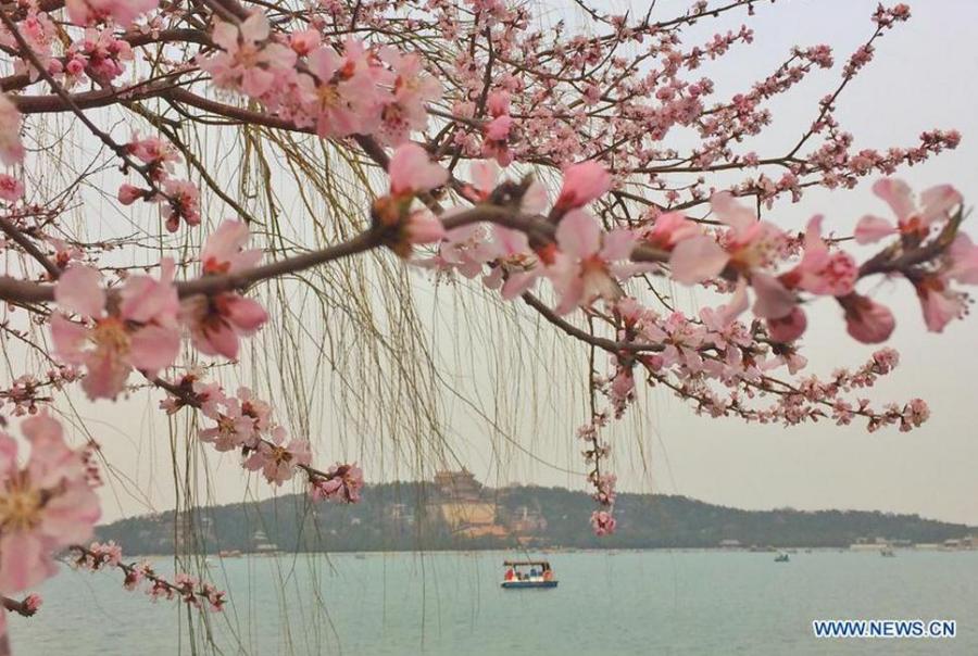 Photo taken on March 19, 2016 shows the blooming peach blossoms at the Summer Palace in Beijing, capital of China. Peach blossoms and magnolia flowers have been in full bloom as temperature rises, attracting lots of people for visit. (Photo: Xinhua/Li Xin)